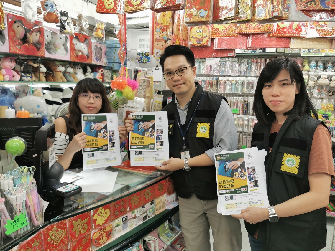 9月26日至30日期間,司警局人員前往新馬路、板樟堂、水坑尾、荷蘭園及高士德等人流密集區份展開防盜防騙宣傳,向商戶和市民派發防罪宣傳單張及紀念品,呼籲店舖負責人及店員做好防範措施,尤其在人流高峰期必須格外留神,以免不法份子渾水摸魚;提醒市民在人多擁擠的地方或購物時,要特別注意保管好個人財物;如外出旅遊亦需做好家居防盜措施;如遇到罪案發生,應立即向警方舉報。