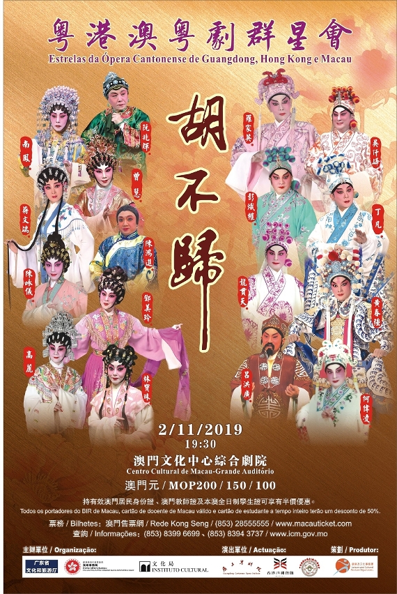 為弘揚粵劇南國紅豆的傳統藝術,加強粵港澳三地文化交流,由廣東省文化和旅遊廳、香港民政事務局及澳門文化局聯合主辦,香港康樂及文化事務署策劃,廣東粵劇院、香港八和會館、中國戲劇曲藝家(澳門)聯誼會三地紅伶擔任演出之粵港澳文化交流活動《粵港澳粵劇群星會》,將於11月2日(星期六)晚上7時30分在澳門文化中心綜合劇院上演傳統名劇《胡不歸》,由三地粵劇界殿堂級紅伶合作演出,門票現正於澳門售票網公開發售。
