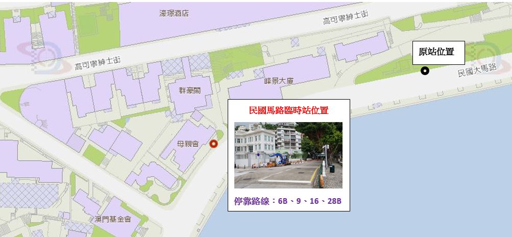 配合電力公司進行電纜及管道鋪設工程,於10月16日(周三)至11月9日(周六),介乎西灣湖街與衣灣斜巷之間一段民國大馬路實施有限度通車,期間,位於該路段的“民國馬路"站臨時往衣灣斜巷方向遷移約90米,搭乘6B、9、16、28B路線巴士之乘客須使用臨時站上落,直至工程完成。交通事務局呼籲乘客留意。