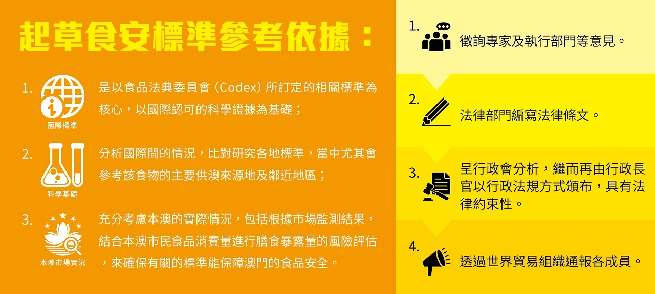 澳門所制定的食安標準是以維護本澳食品安全與公眾健康為首要原則,並且須同時兼顧在標準推出後,不會對本澳食品的穩定供應構成影響。而標準的制定是在國際認可的「風險分析」框架下進行,以食品法典委員會(Codex)的標準為骨幹,同時根據嚴謹的科學證據為基礎,分析國際間以及主要食品來源地的標準,再充分考量澳門居民的日常飲食習慣與食物消費量等因素,綜合考量各項實際情況而制定出來。而這些在本澳具法律約束性的食安標準,最終亦須透過「世界貿易組織」通報各成員,以履行國際義務。