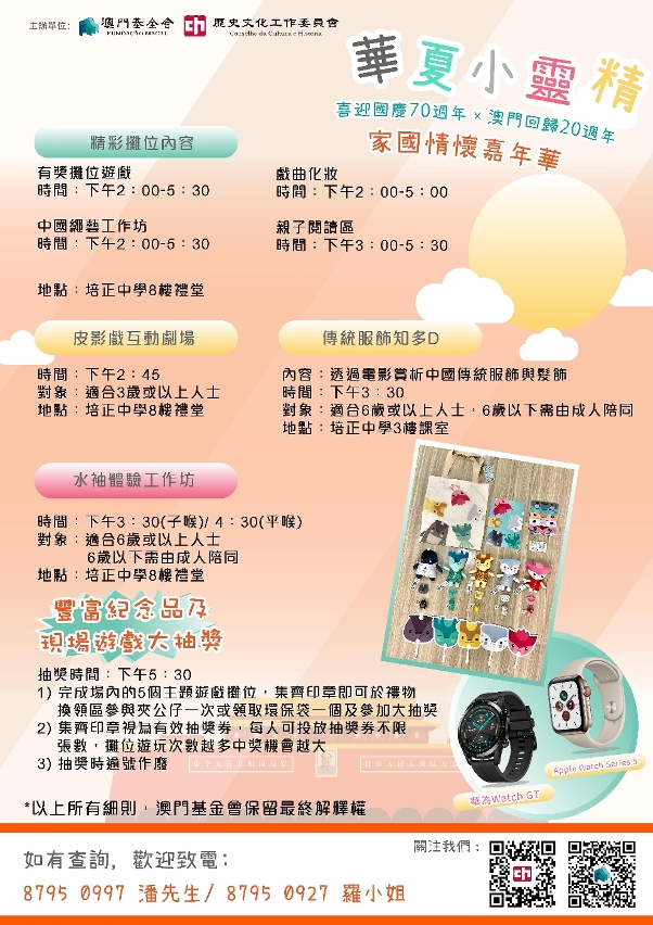 為慶祝中華人民共和國成立70周年暨澳門回歸祖國20周年,促進市民對中華及本土歷史文化的認識,澳門基金會及其歷史文化工作委員會於本年12月7日(星期六)下午2:00-5:30於培正中學舉辦“喜迎國慶70週年 X 回歸20週年─華夏小靈精家國情懷嘉年華”,透過攤位遊戲、工作坊、展示等形式,靈活生動地介紹中華文化及雙慶相關主題內容,加深市民對祖國的認識,了解澳門回歸前後的變遷。