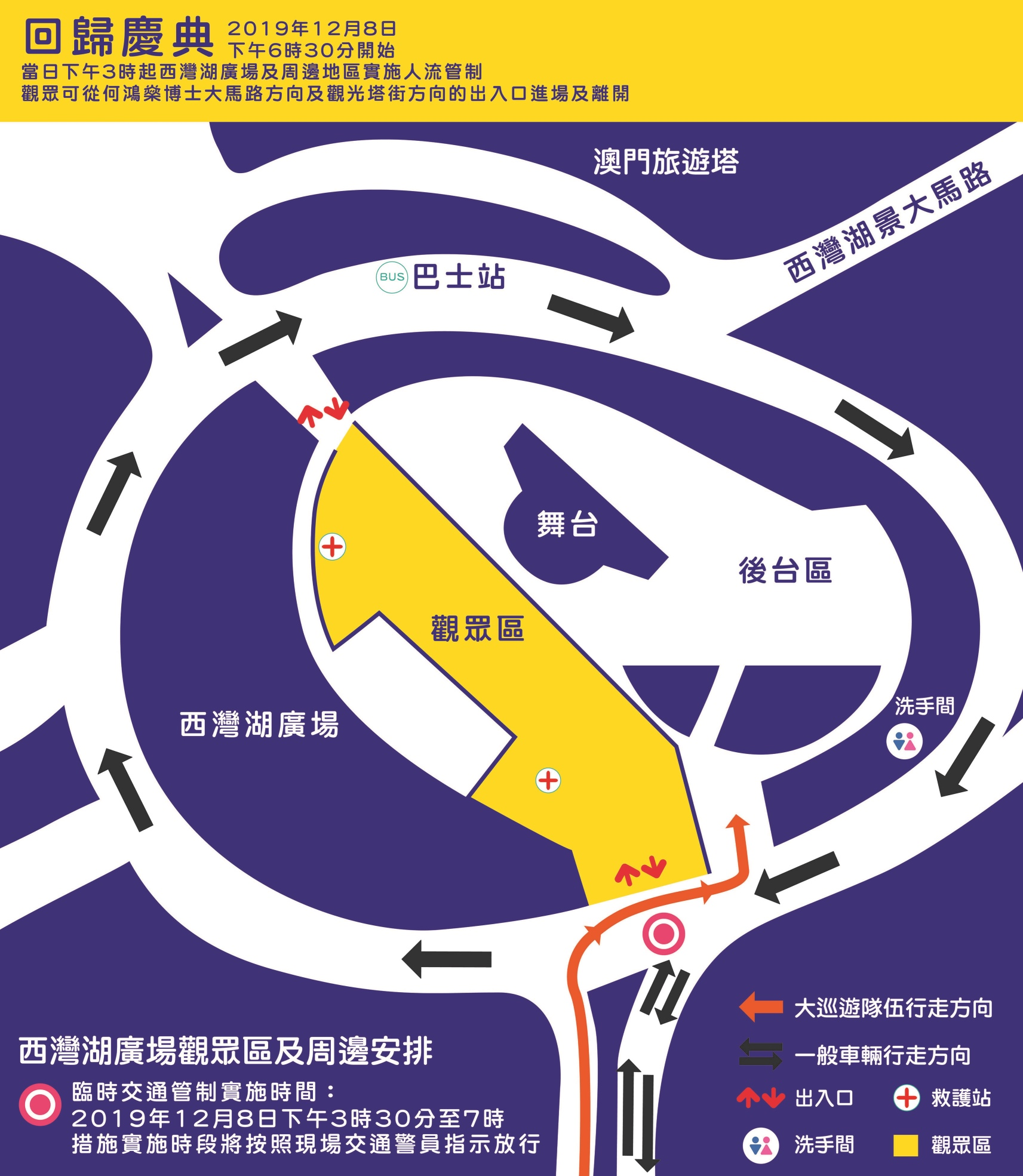 由文化局主辦的慶祝澳門回歸祖國二十周年“2019澳門國際幻彩大巡遊”將於12月8日(星期日)舉行。為方便市民和遊客投入參與大巡遊活動,將實施一系列相應道路安排及觀眾入場指引。