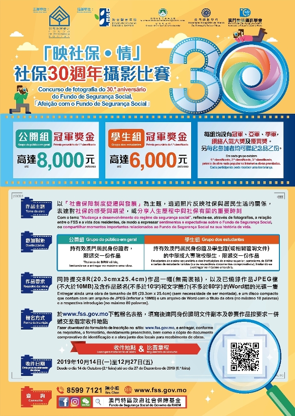 由社會保障基金主辦的“映社保‧情”社保30週年攝影比賽將於12月27日截止收件,比賽旨在讓居民一同見證社保歷年發展,啟發參加者思考雙層式社會保障制度對保障居民生活素質所起到的作用。比賽分學生組和公開組兩個組別,獎金最高達8,000澳門元,歡迎全澳居民踴躍參與。
