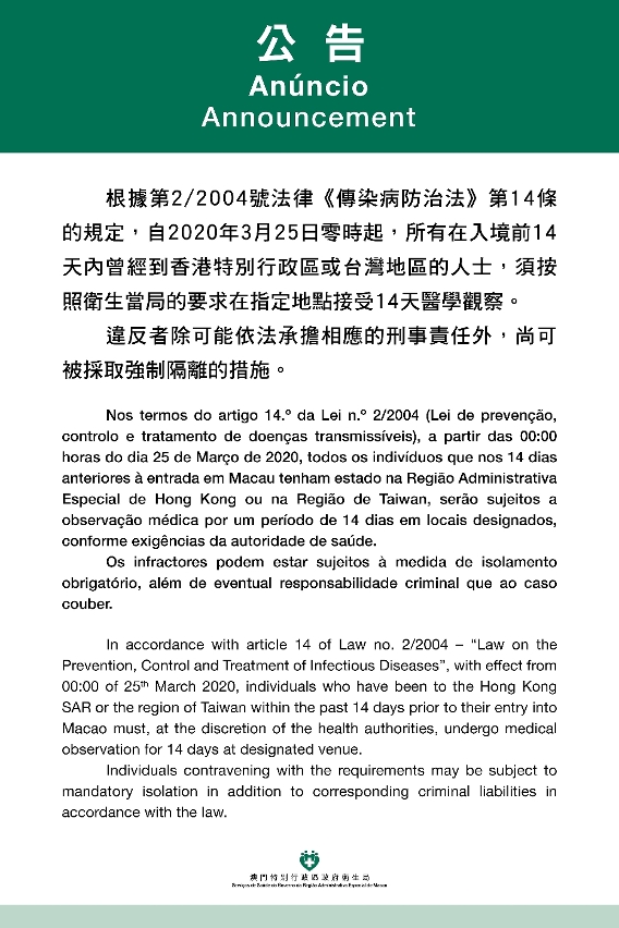 新型冠狀病毒感染協調中心表示,鑑於全球新型冠狀病毒肺炎疫情近期趨嚴 重,衛生局根據第 2/2004 號法律《傳染病防治法》第 14 條的規定,自2020年3月25日零時起,所有在入境前14天內曾經到過香港特別行政區或台灣地區的人士,須按照衛生當局的要求在指定地點接受14天醫學觀察。