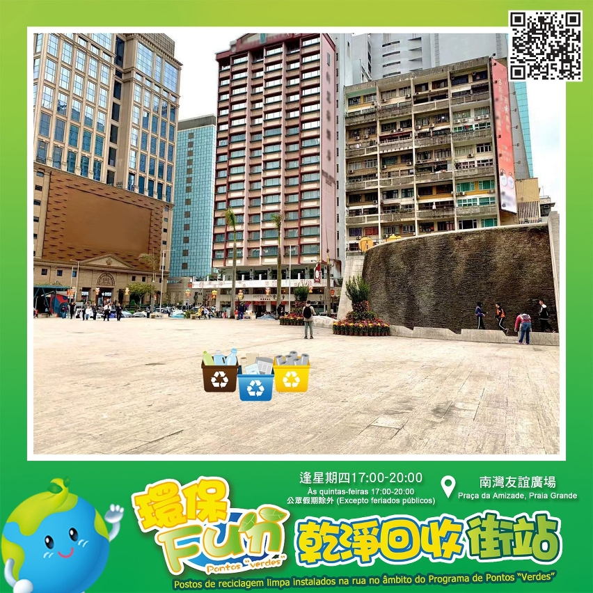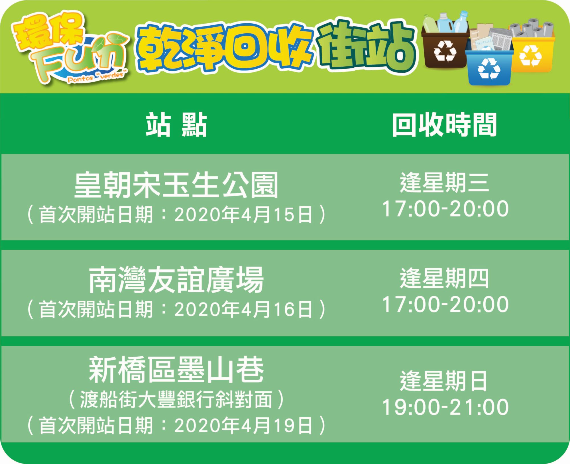 為響應每年4月22日的“世界地球日”,宣揚環境保護的訊息,進一步推動市民實踐分類回收,環境保護局在現有19個“環保Fun”回收點的基礎上再作優化,與環保團體合作,由本月15日起將陸續在皇朝宋玉生公園、南灣友誼廣場以及新橋區墨山巷(渡船街大豐銀行斜對面)設置“環保Fun乾淨回收街站”,並增設晚間或周日的回收時段,以便“上班族”和市民於下班後或假日實踐乾淨回收(詳細內容請見附圖)。