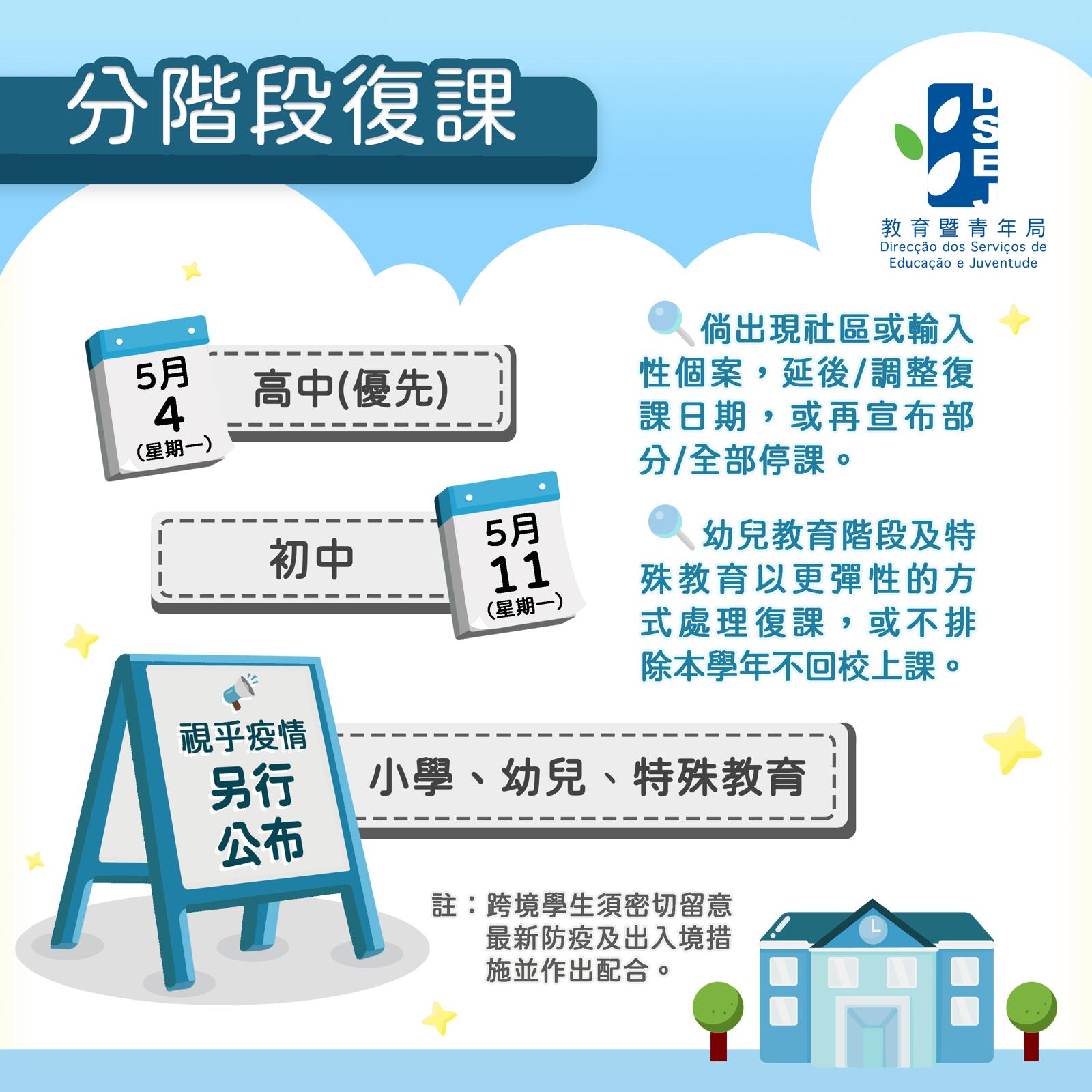 考慮到本澳目前的情況,經聽取衛生部門的專業意見後,科學研判非高等教育自5月起復課(見下表)。教青局呼籲跨境師生,必須密切留意最新的防疫及通關政策,做好準備。