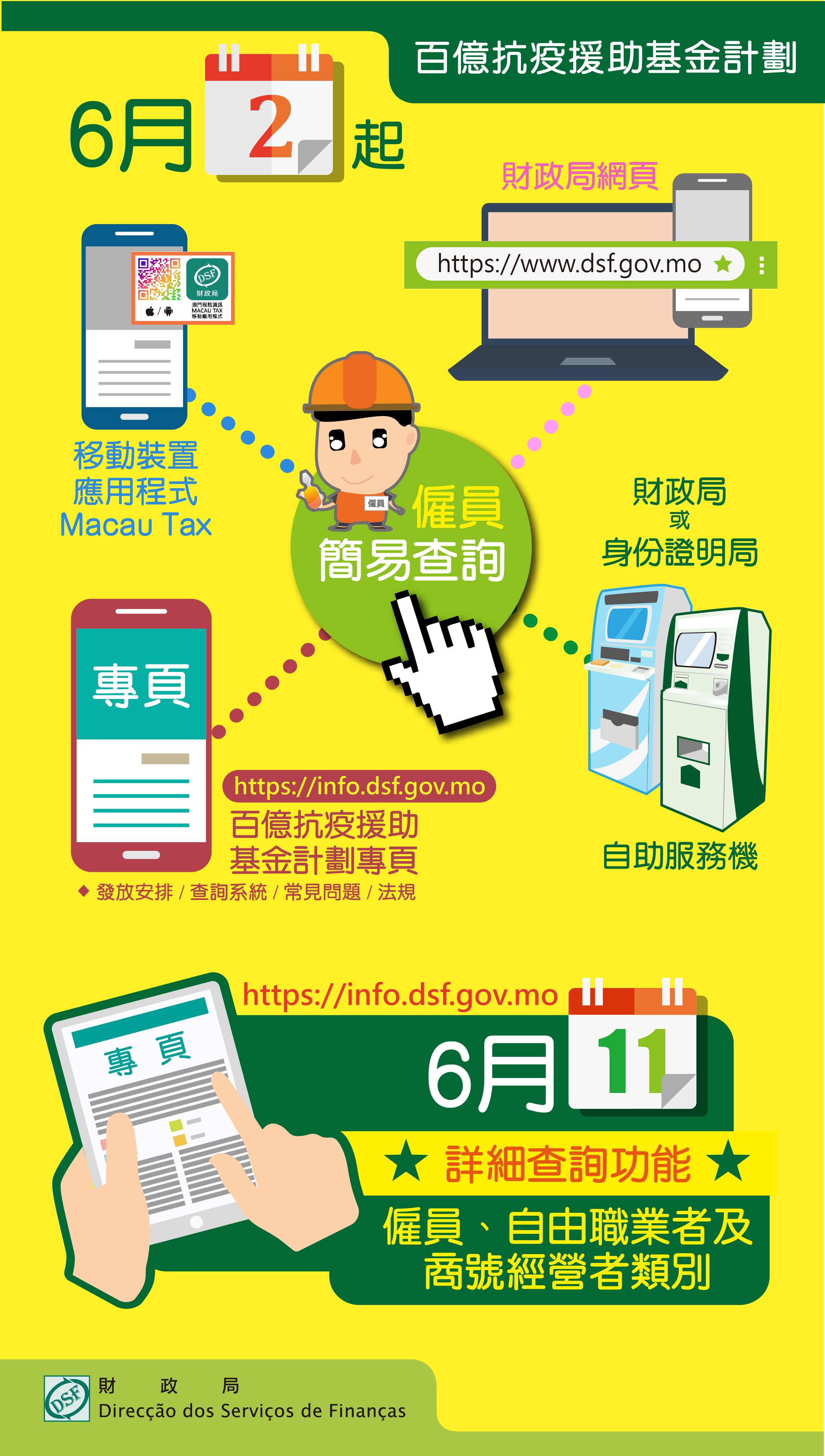 財政局於6月2日推出僱員類別的簡易查詢功能,僱員可透過為援助款項計劃而設的網上專頁(https://info.dsf.gov.mo)、財政局網頁(https://www.dsf.gov.mo)、Macau Tax移動裝置應用程式,以及財政局或身份證明局的自助服務機查核其個人受益狀況;自由職業者及商號經營者於6月11日起亦可透過上述途徑進行查詢。網上專頁同時提供行政法規、常見問題、簡易圖文包及發放安排等各類資訊,讓巿民隨時查閱。