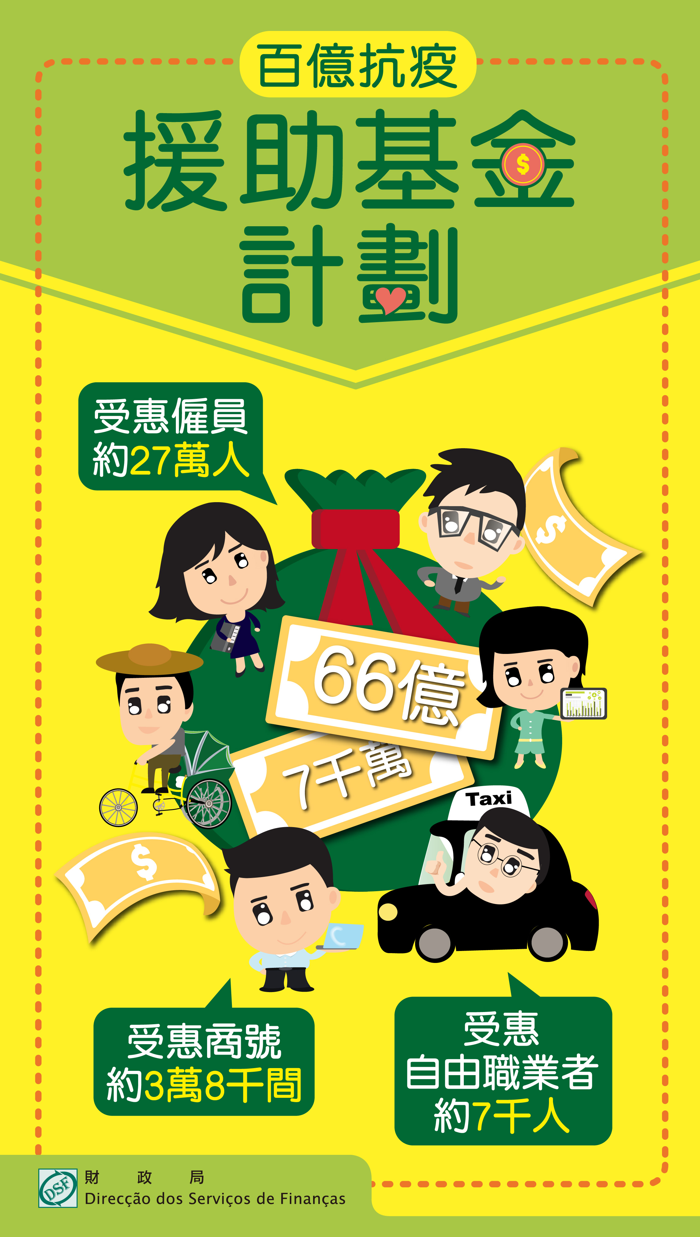 是次《僱員、自由職業者及商號經營者援助款項計劃》涉及預算總開支約66億7千萬元,由澳門基金會預算承擔,預計受惠僱員人數約27萬人、受惠自由職業者約7千人,受惠商號約3萬8千間。