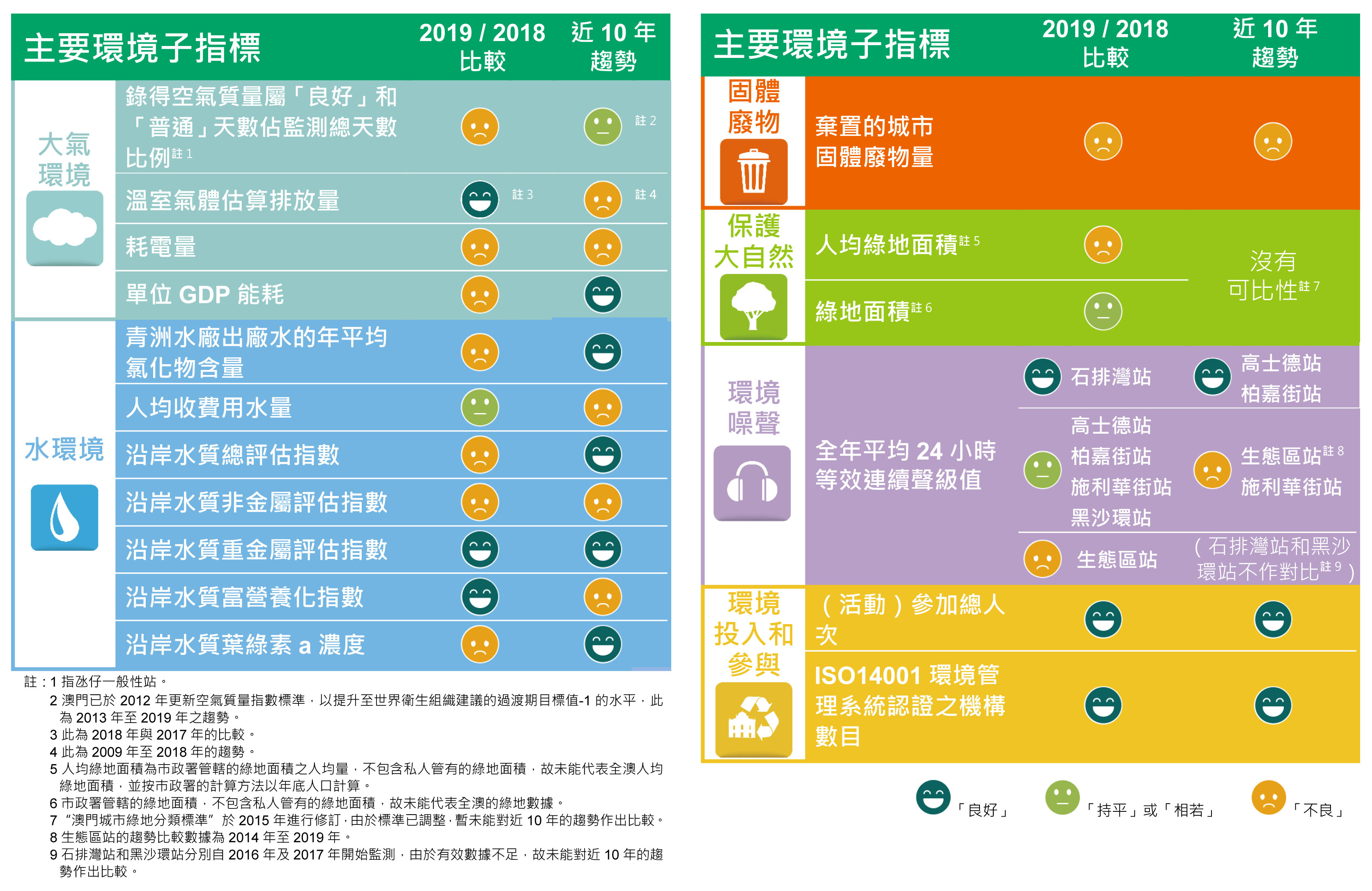 2019年各監測站錄得空氣質量屬“良好”和“普通”天數為89%或以上,較2018年減少,臭氧(O3)仍是主要的空氣污染物,而可吸入懸浮粒子(PM10)及微細懸浮粒子(PM2.5)年平均濃度均達標且呈下降趨勢,與粵港澳珠三角區域空氣整體變化趨勢一致。