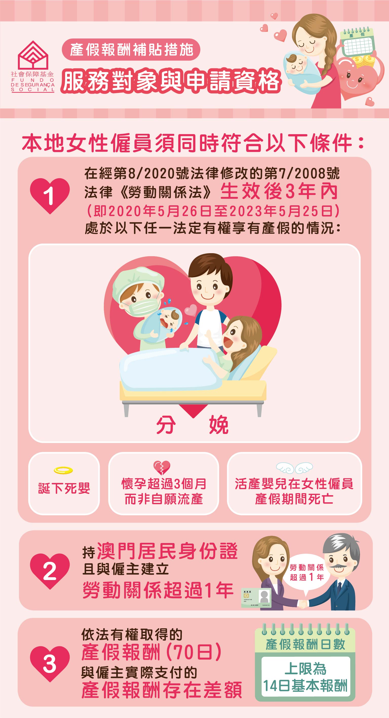 第8/2020號法律《修改第7/2008號法律〈勞動關係法〉》已於2020年5月26日起生效,該法律規定,產假由原來的56日調升至70日,並設有過渡規定,訂明在法律生效後三年內(即在2020年5月26日至2023年5月25日期間),澳門特別行政區向符合條件的本地女性僱員發放產假報酬補貼。為此,特區政府制定了《產假報酬補貼措施》行政法規,以訂定產假報酬補貼的申請及發放程序。