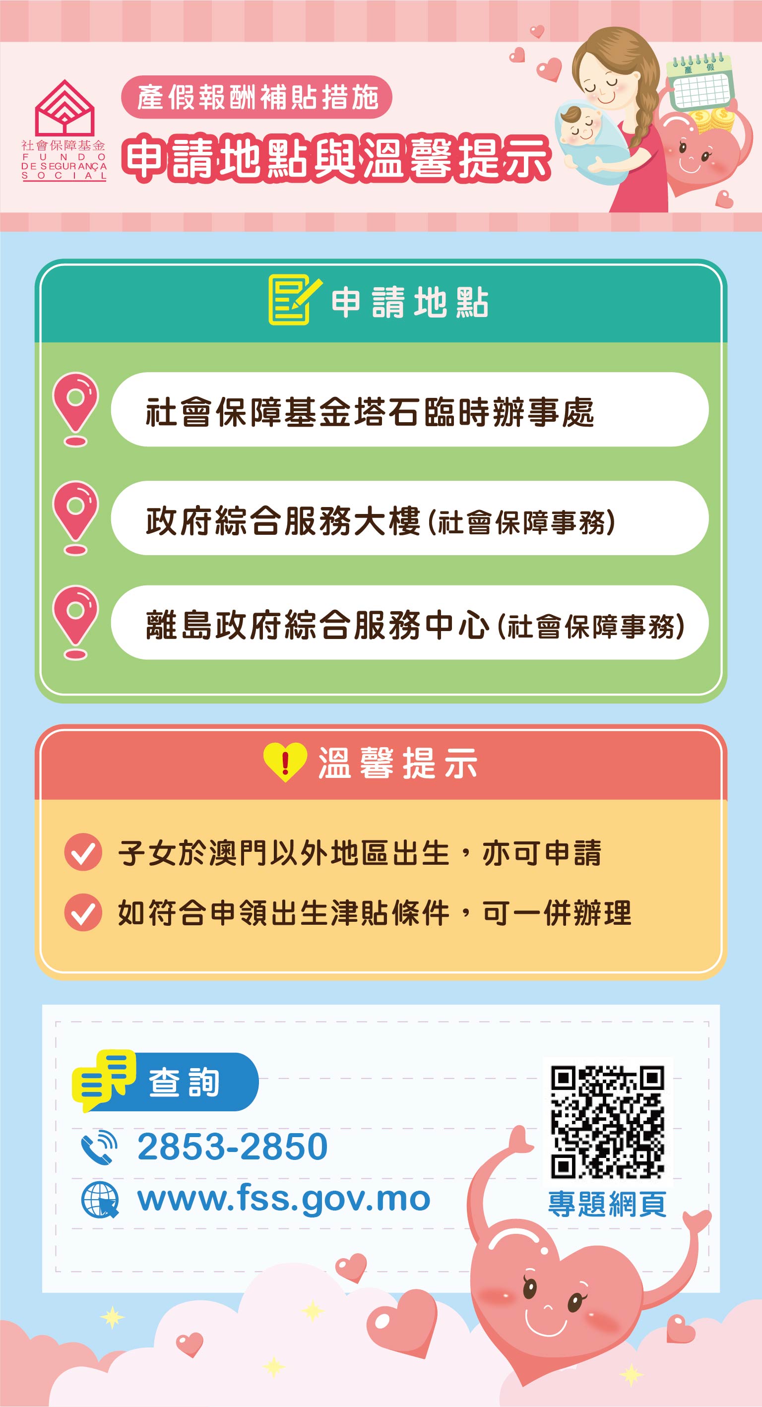 法規規定,在法律生效後分娩或出現法定可享有產假的情況,且發生有關事實時勞動關係已超過一年的本地女性僱員,應自有關事實發生之日起計120日內向社會保障基金申請產假報酬補貼,該基金則應自收齊申請所需文件之日起60日內作出決定,並在作出批准決定後的翌月內向有關僱員發放補貼。