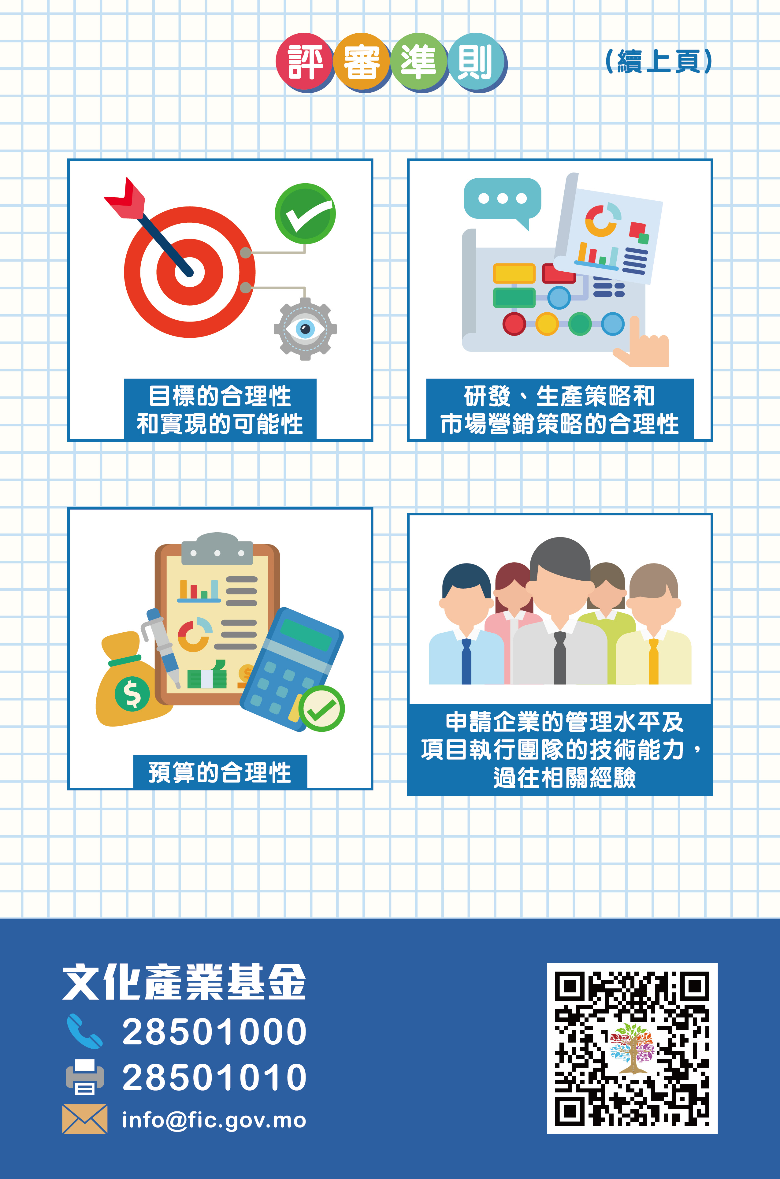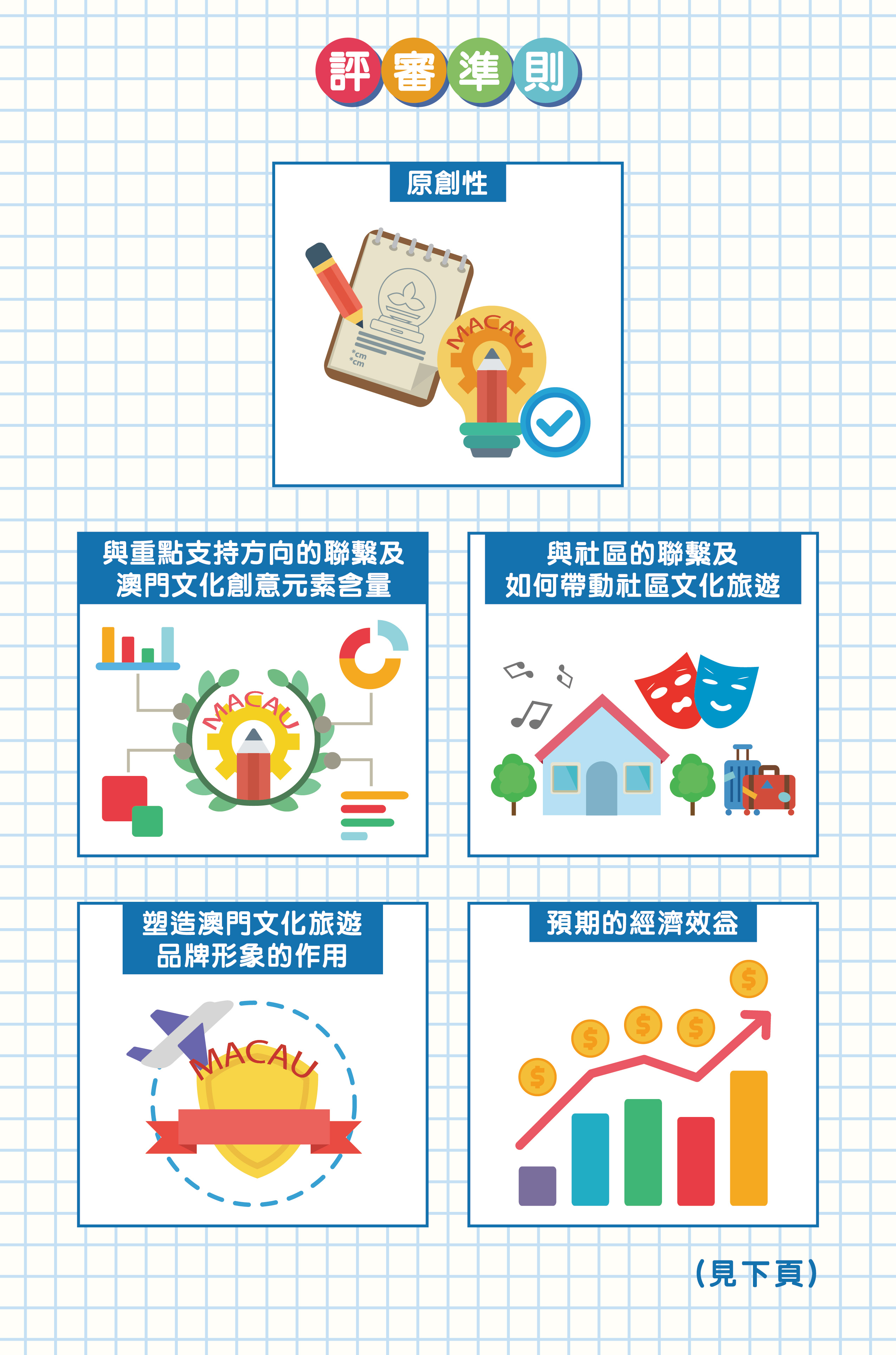 評審將根據申請項目的原創性、是否符合該專項計劃目的(澳門文化元素含量)、與社區的聯繫、對推廣澳門旅遊、塑造澳門文化旅遊品牌形象的作用、預期的經濟效益、目標的合理性和計劃實現的可能性、預算的合理性、申請企業管理水平、執行團隊技術能力及過往相關經驗,以及研發、生產策略和市場營銷策略的合理性作為評審準則。