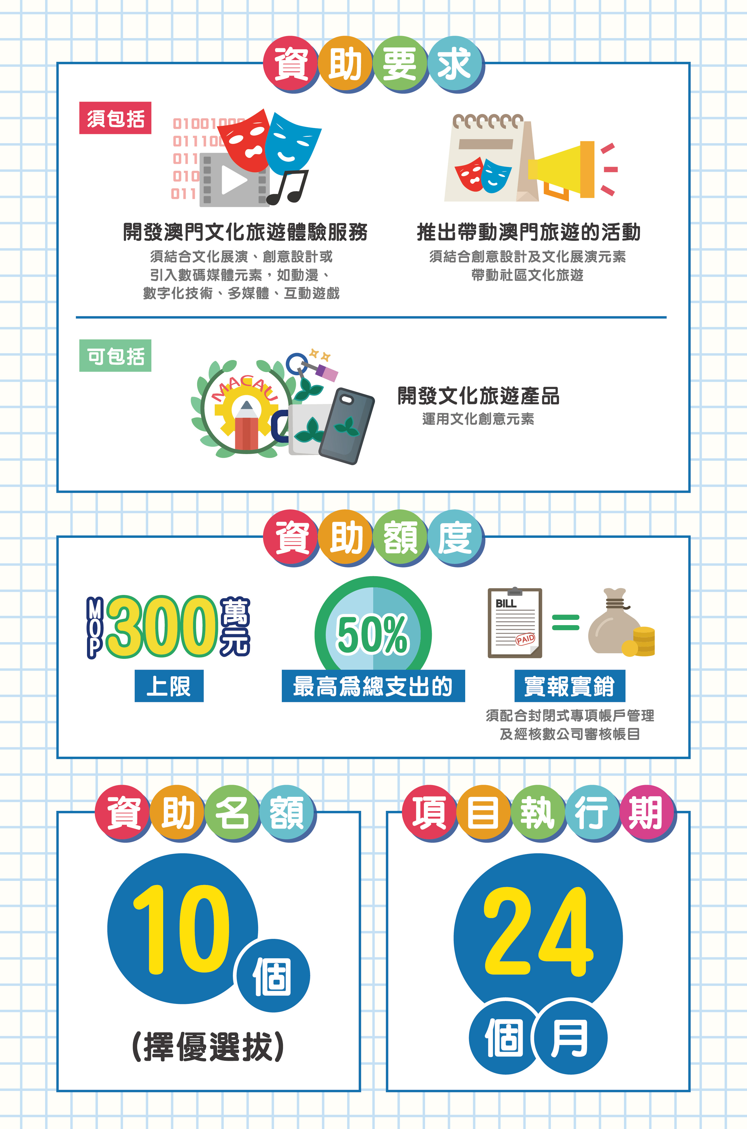文化產業基金將擇優選拔專項資助計劃的申請項目,資助名額10個,項目執行期24個月。資助額度為項目總支出的50%,每個項目的資助上限為300萬澳門元。基金以實報實銷形式對企業作出資助,資助款項以封閉式專項帳戶管理,並經核數公司審核帳目,以確保公帑的有效運用。有意申請的企業可透過網頁(www.fic.gov.mo)下載申請表格,如有疑問,歡迎致電2850 1000或電郵 info@fic.gov.mo 向文化產業基金查詢。