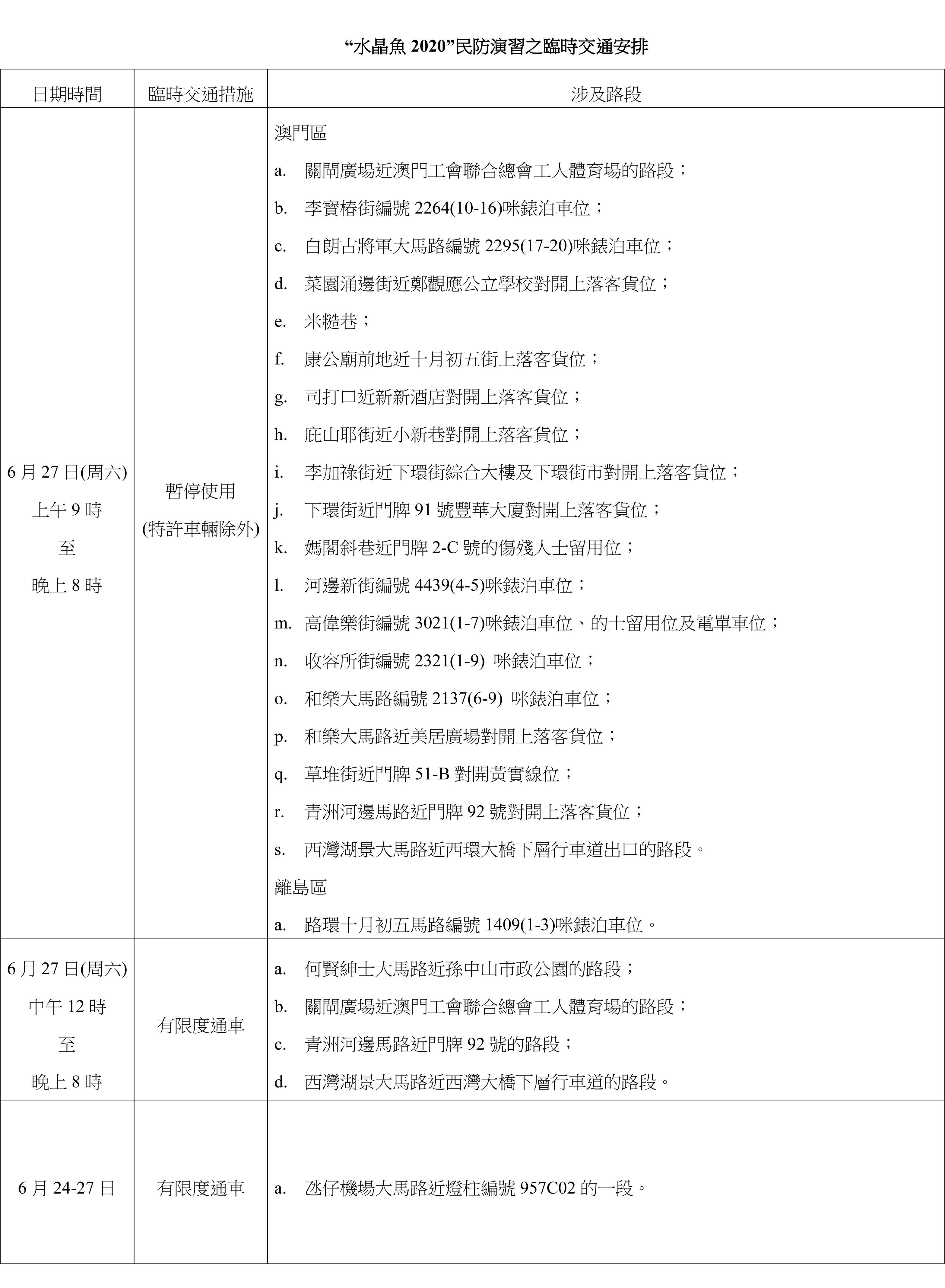 警察總局將聯同地球物理暨氣象局、社會工作局、市政署及交通事務局等30個民防架構成員,於明天6月27日(星期六) 下午一時至七時,進行代號 “水晶魚2020”實地颱風演習,以檢視及優化各項應急預案,強化民防架構成員間的溝通及聯動能力,及提升市民大眾對 “颱風期間風暴潮低窪地區疏散撤離計劃”( 下稱 “疏散撤離計劃”)的熟悉度和配合度。