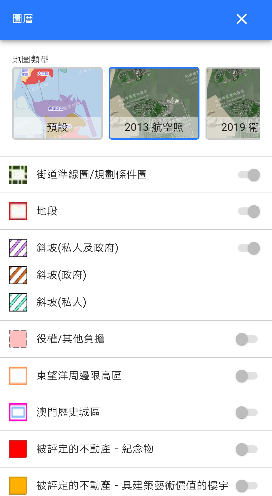 此外,使用者亦可在地形圖層及航空(或衛星)圖層間作切換,以滿足不同使用者的需求,在《地籍資訊網》桌面版(https://cadastre.gis.gov.mo)上亦會提供此功能。