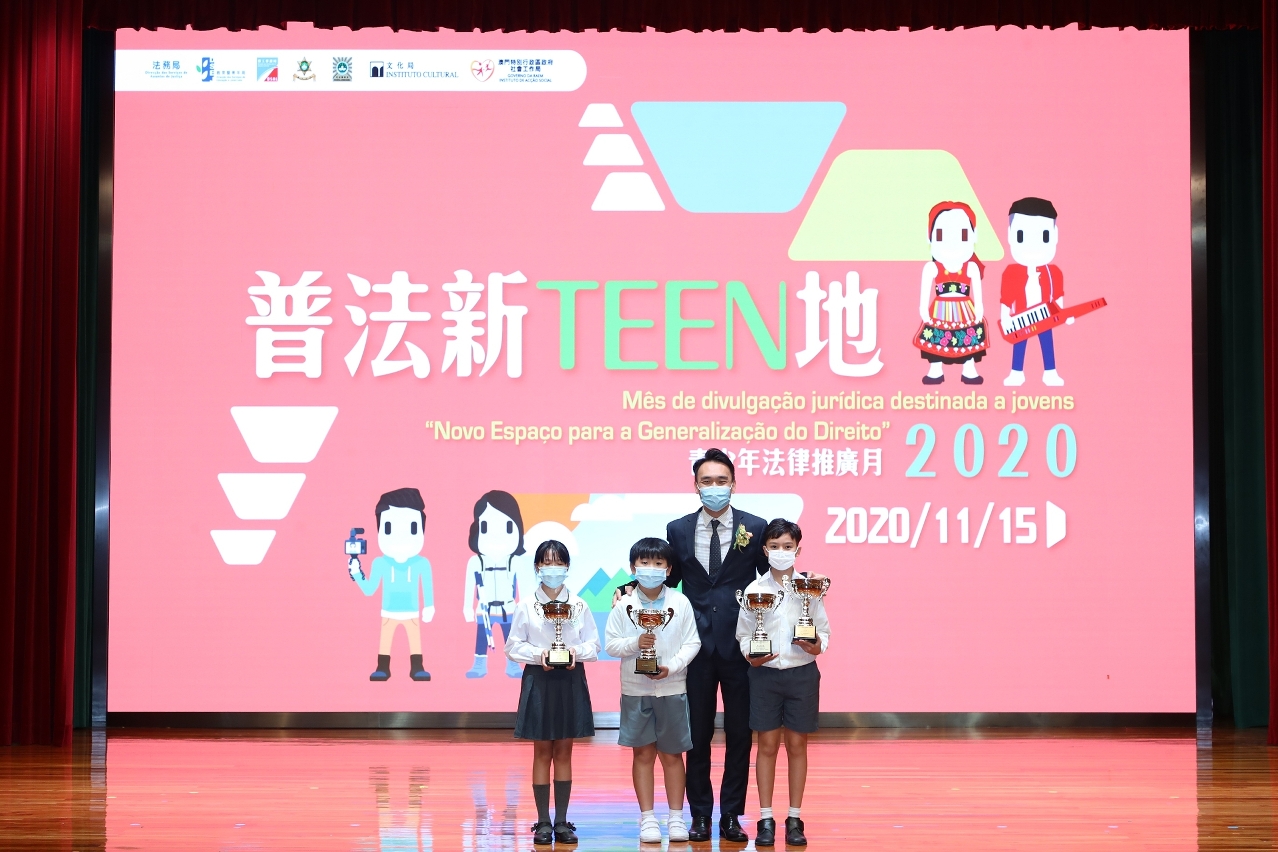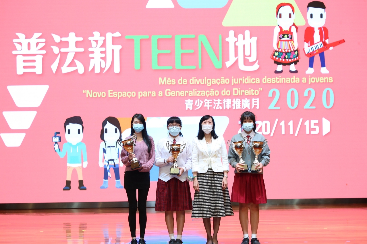 為延續推廣法律普及的工作及總結有關活動成效,上述部門於11月15日假婦聯學校禮堂舉行了“普法新TEEN地”青少年法律推廣月總結暨頒獎禮,出席嘉賓包括警察總局劉運嫦局長助理、教育暨青年局龔志明副局長、法務局梁葆瑩副局長、文化局梁惠敏副局長、教育暨青年局青年廳張敏輝廳長、社會工作局防治賭毒成癮廳鄭耀達廳長、司法警察局社區警務及公共關係處鄭寶湘處長、治安警察局公共關係處李德輝副警務總長、市政署公民教育處林微笑處長、高等教育局高等院校學生輔助處黃月冰處長、勞工事務局准照及技術支援處林佩馨代處長、法務局公共關係處黃嘉慧代處長、消防局研究及策劃廳李梓豪副一等消防區長、青年事務委員會委員,以及各參與學校及機構代表等。