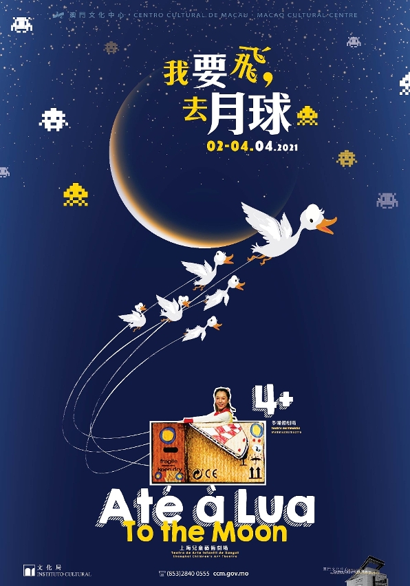 《我要飛,去月球》將於4月2日至4日(星期五至日)在澳門文化中心小劇院上演三場,演出以普通話進行,附中文及英文字幕。門票於1月31日起在澳門文化中心及澳門售票網公開發售,票價為180澳門元,設多項票務優惠。文化局將嚴謹按照衛生部門相關防疫指引,對藝文活動作出妥善安排,參與活動之市民必須佩戴自備口罩、接受體溫探測,並出示當天的個人健康碼。