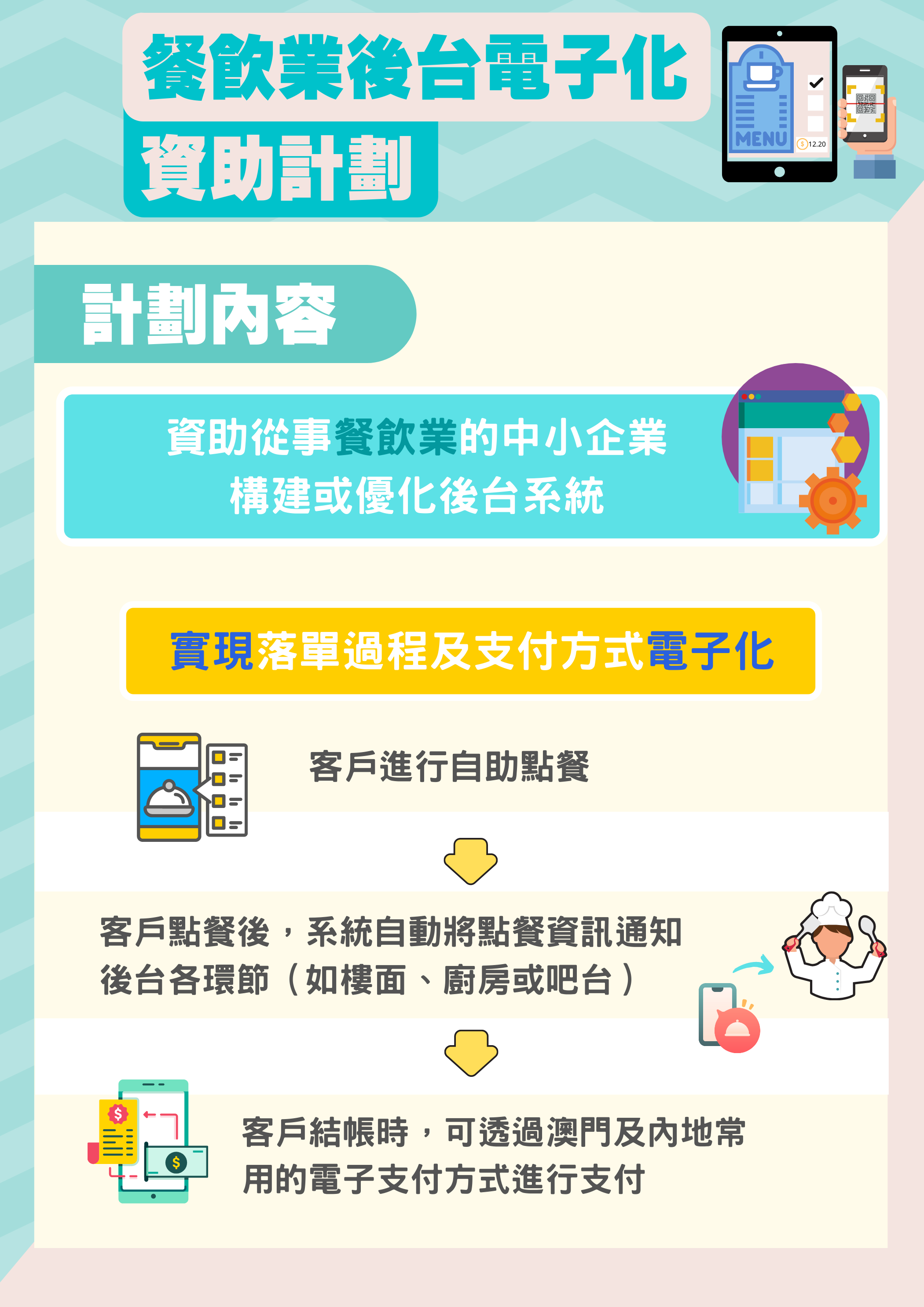 為鼓勵中小企發展移動化商業模式,尤其是利用數字化解決方案提升營運效率,首階段經濟及科技發展局將支持商會推出“餐飲業後台電子化資助計劃”。參與的中小企可通過安裝系統及設備以實現落單、通知後台及付款全程電子化。
