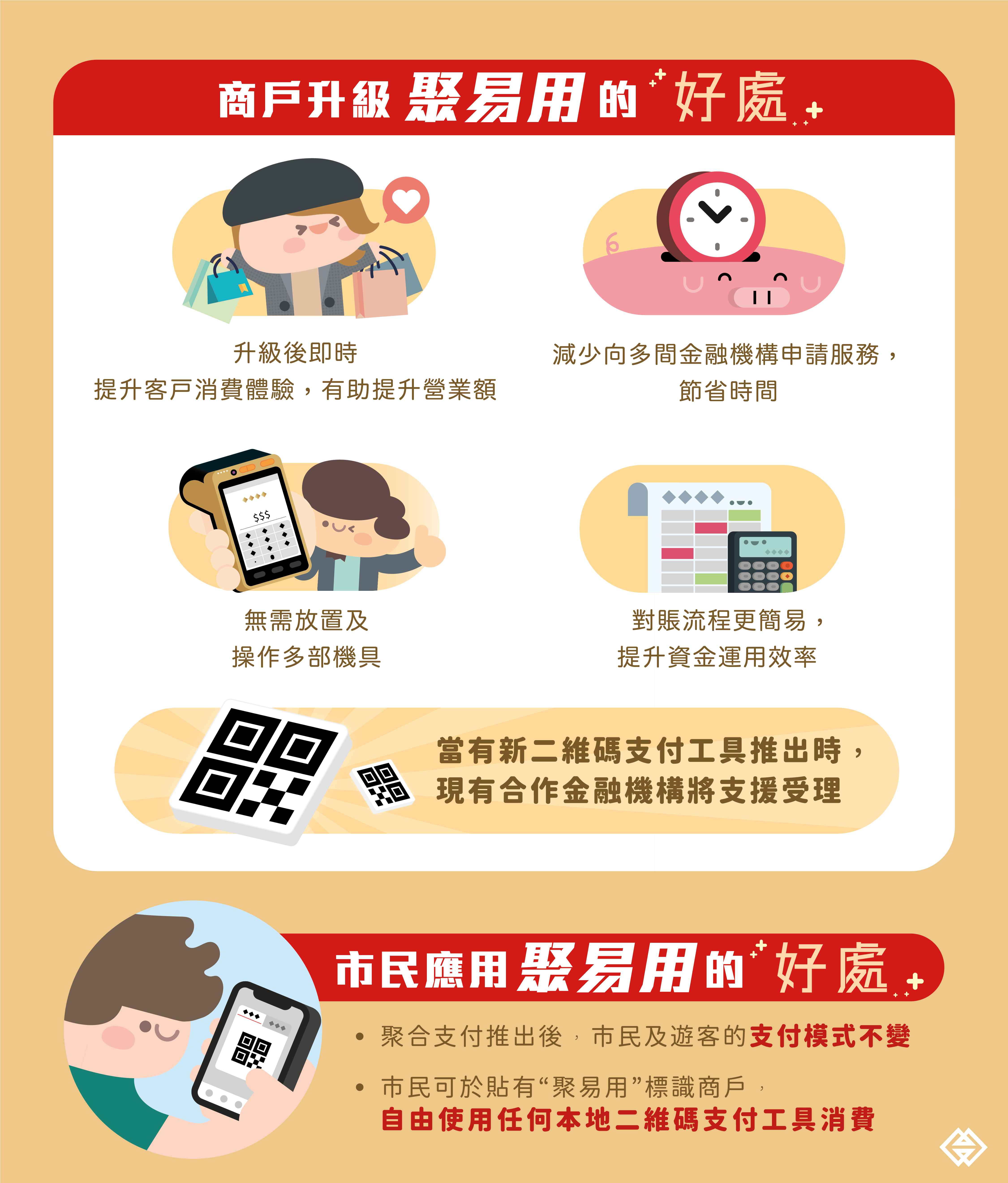 金管局呼籲商戶積極主動升級,現已受理本地二維碼支付的商戶,如欲升級“聚易用”,只需由現有合作金融機構安排更新服務協議及機具軟件,毋需申請額外機具;而現未有受理本地二維碼支付的商戶,也可聯絡相關金融機構瞭解詳情。有關資訊,可瀏覽“聚易用”專題網頁。