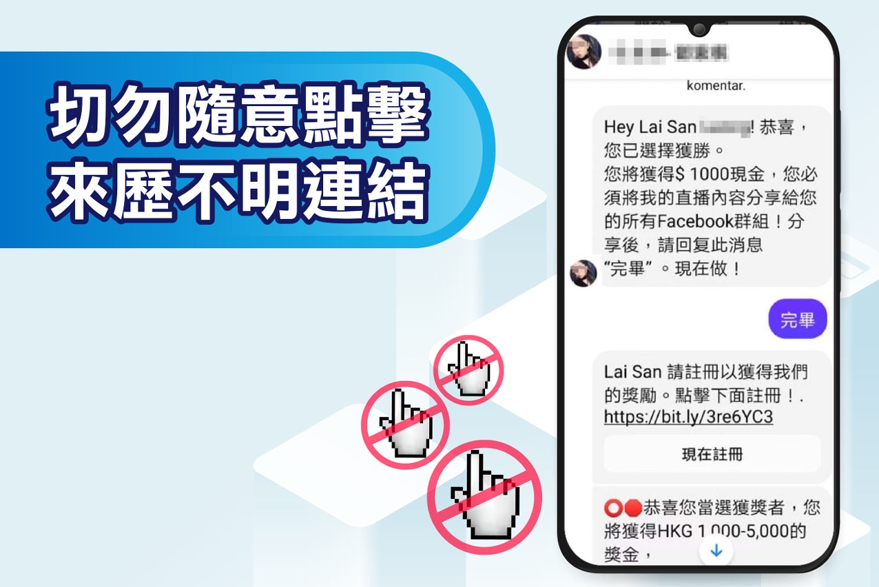 近日司警局接獲市民舉報,稱於網絡社交平台接到與香港某位女明星同名的帳號發送的訊息,內容指事主當選獲獎者,只要事主在網絡社交平台朋友群組內分享該位“女明星”的直播內容,並點擊該條訊息內附有的連結及註冊,便可獲得1,000至5,000港元現金。該名市民懷疑有人藉此騙取個人資料,故沒有上當,並馬上向司警局作出舉報。
