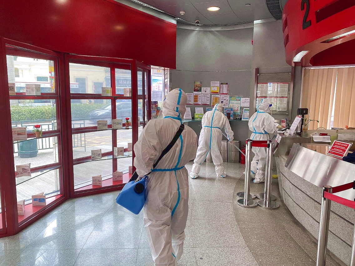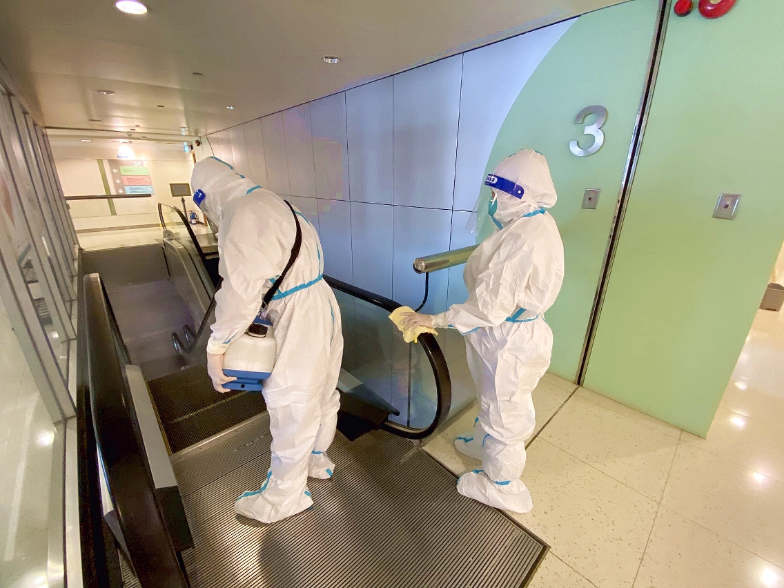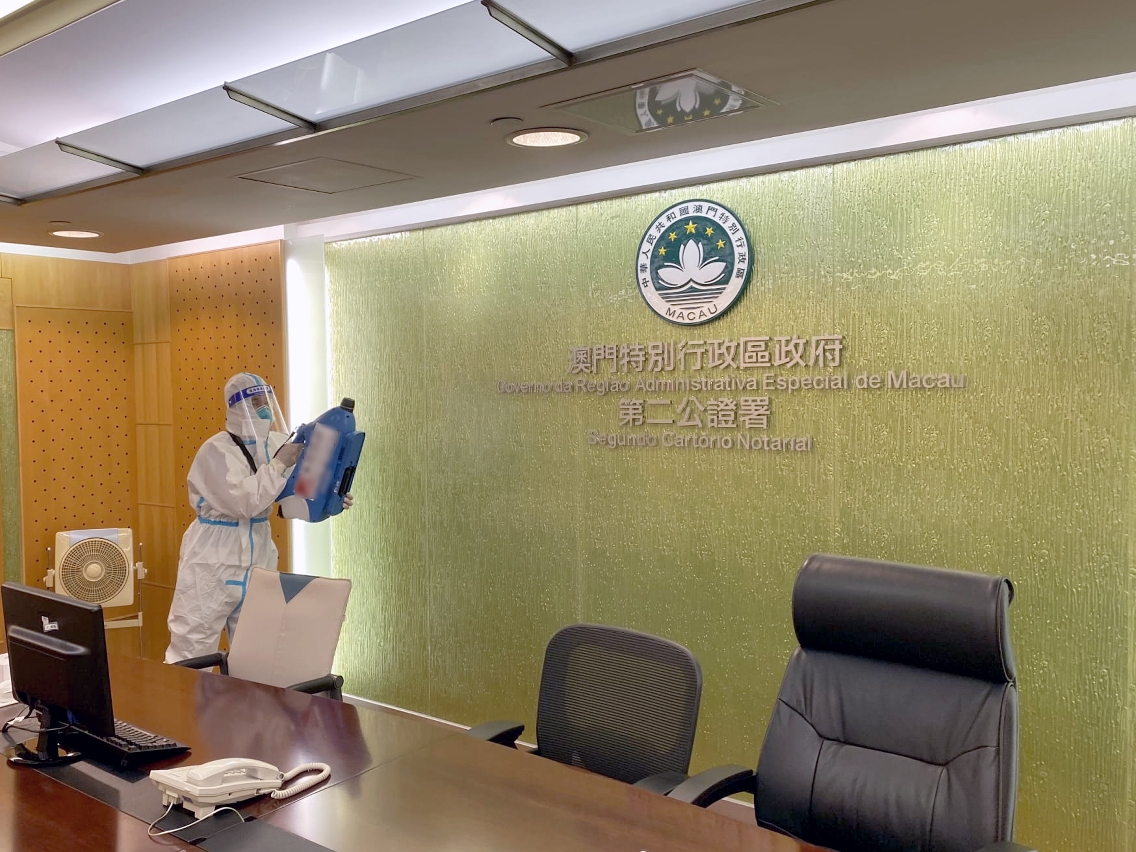 清潔人員穿上防護衣,分別對公共行政大樓之對外服務點,包括大堂、服務櫃位、升降機、手扶電梯及相關辦公室等進行全面清潔消毒,有關工作已於今日上午完成。同時亦已對公共街道及巴士站等公共區域加強清潔及消毒工作,盡力減低傳染病傳播的條件。