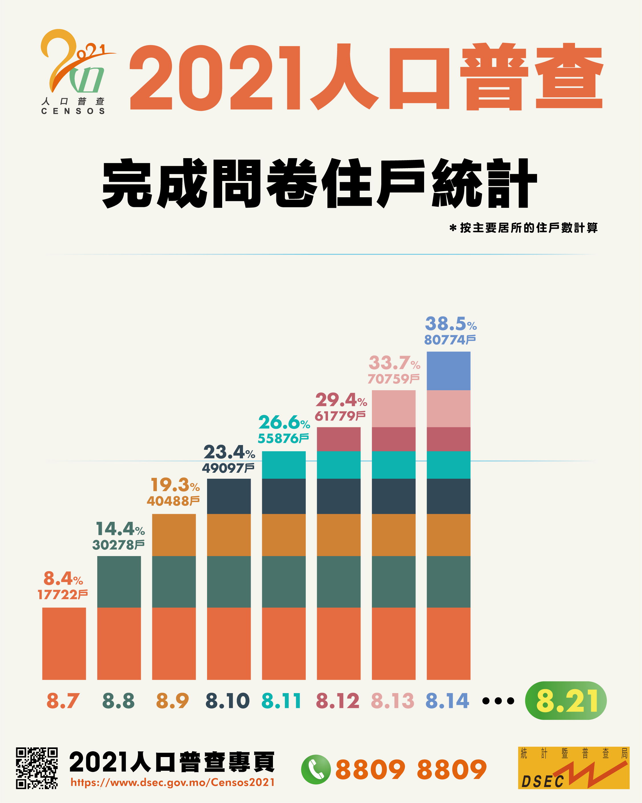 為期15日覆蓋全澳住戶的人口普查資料收集期已進行了一半,截至8月14日,全澳超過8萬個住戶,約佔總數38.5%已完成及提交問卷。統計暨普查局呼籲廣大市民盡早透過網上、電話或填答紙本問卷方式提交資料。