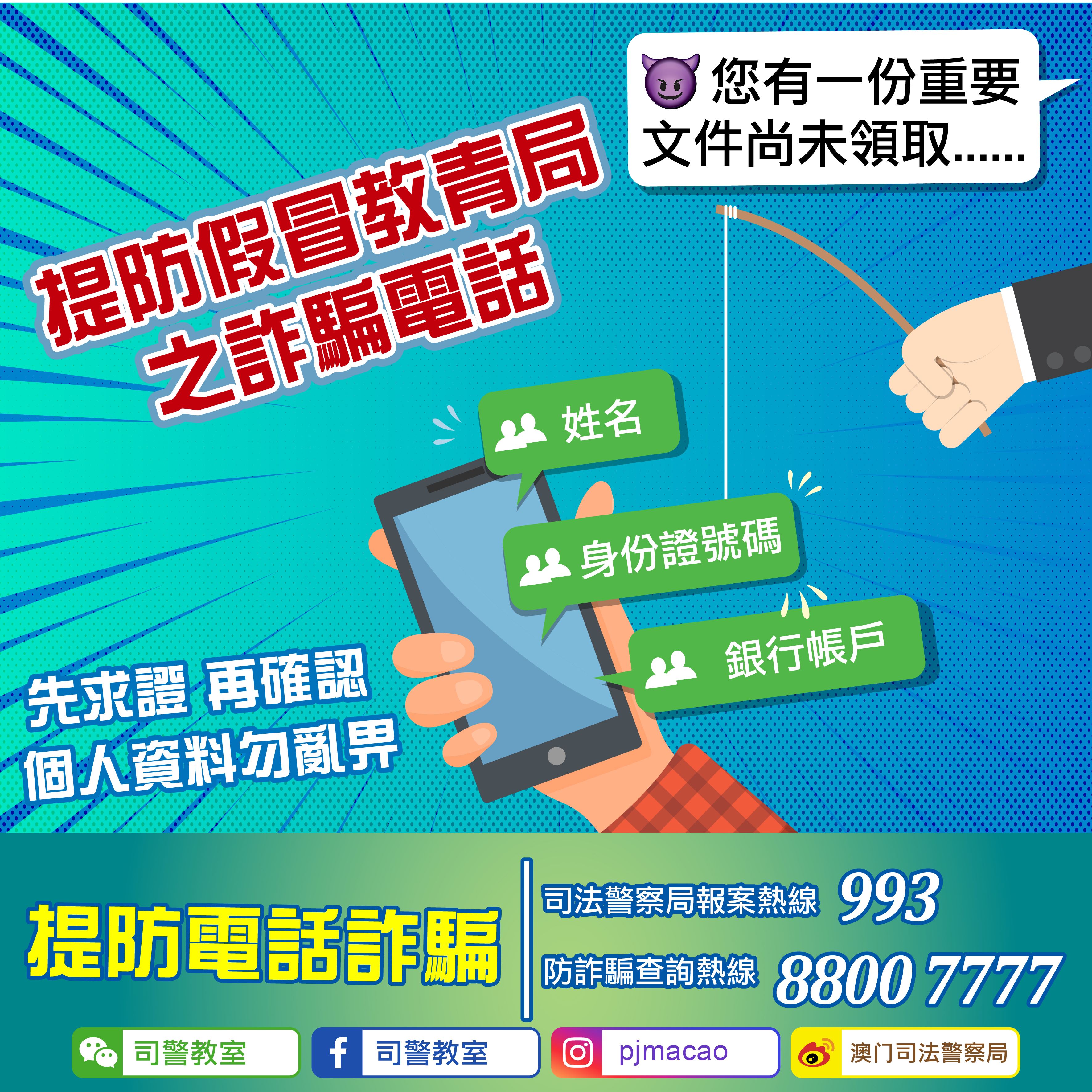 司法警察局今日接獲教育及青年發展局通報,指有市民接到一通附有語音訊息的陌生來電,內容稱事主有一件“教青局發出的郵包”尚未領取,事主覺得可疑立即掛線,並馬上致電該局瞭解事件真偽,證實並無此事。