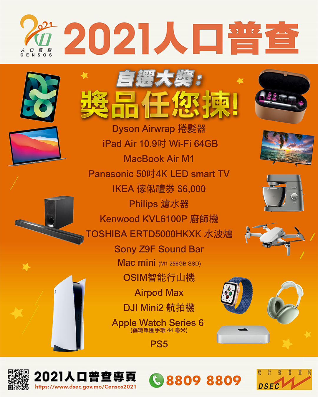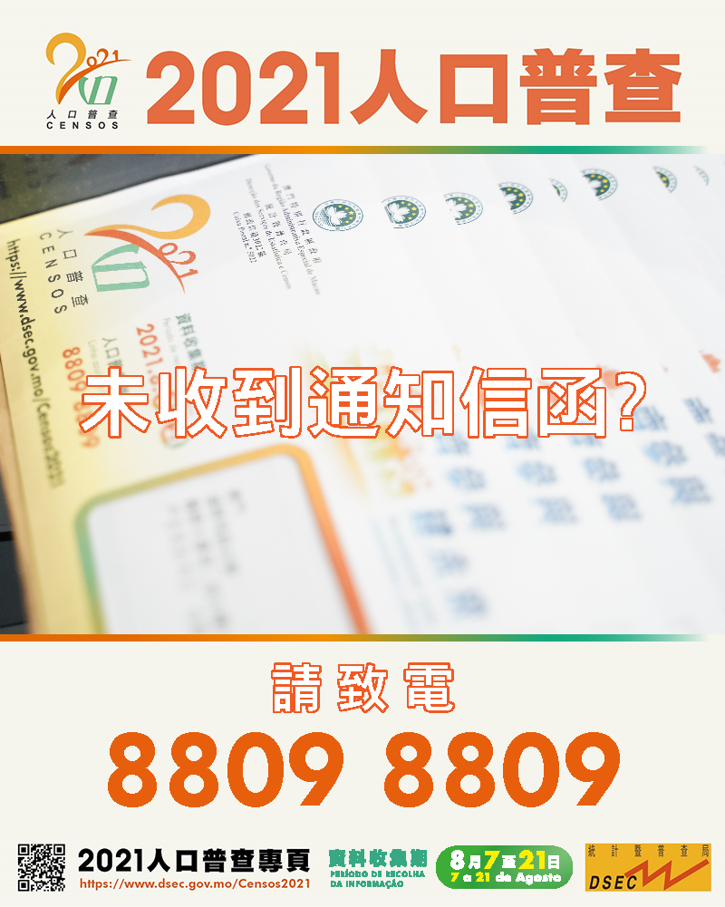 有關人口普查詳情,請瀏覽2021人口普查專頁(https://www.dsec.gov.mo/Censos2021)或致電人口普查熱線8809 8809查詢。