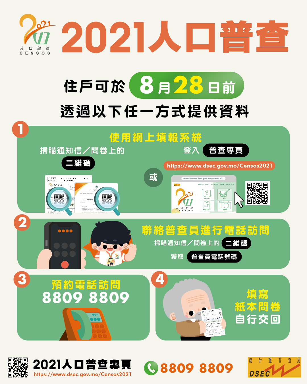 至8月28日(本周六)前,住戶仍可透過網上或電話方式提供資料。短式問卷的住戶亦可預先填妥隨通知信函郵寄給住戶的紙本問卷,再交予到訪的普查員或交回6個人口普查工作站。此外,長、短式問卷住戶均可致電人口普查熱線8809 8809開通網上填報或預約普查員到訪。如果住戶已完成問卷,普查員將不會到訪有關單位。