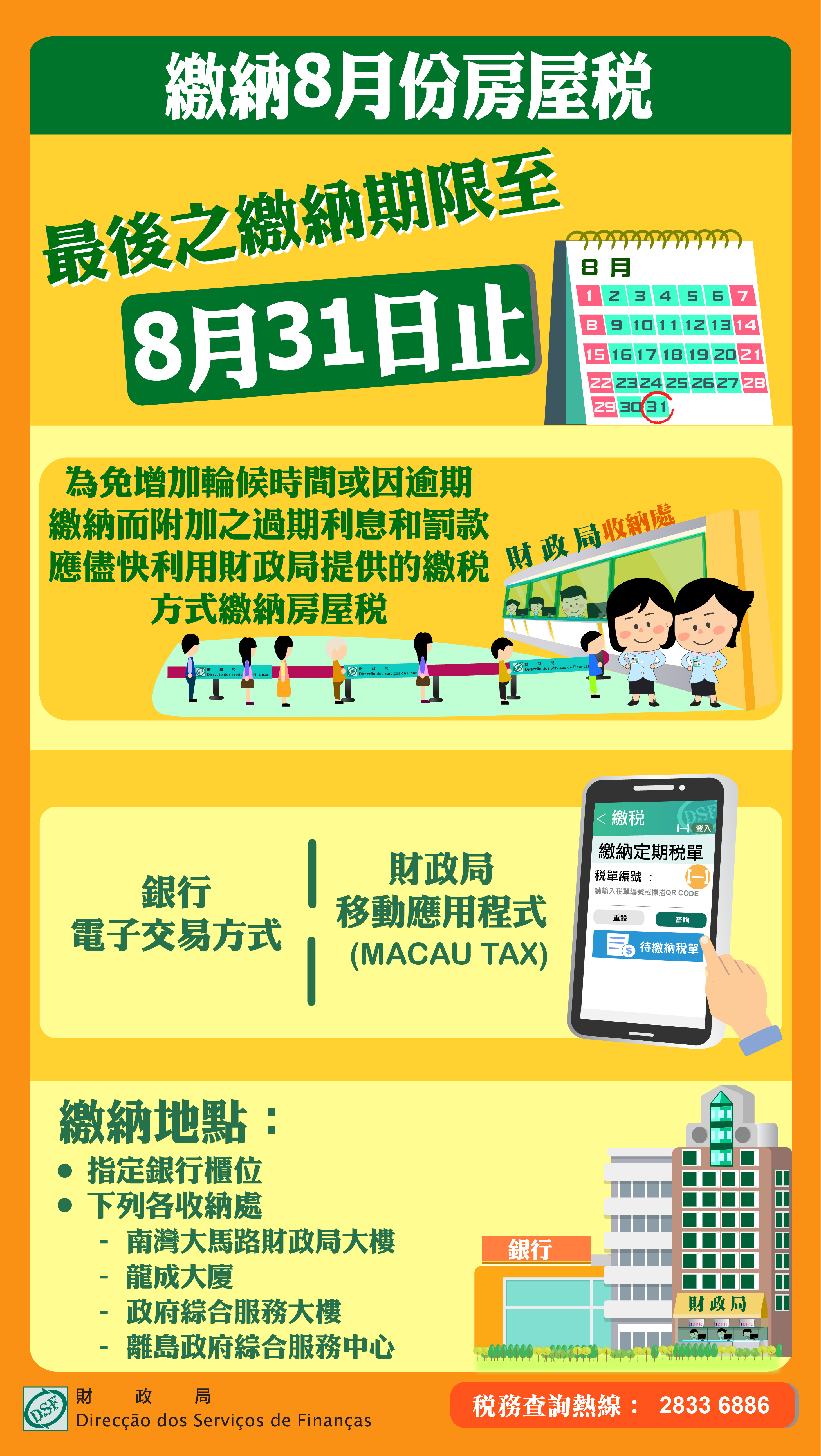 財政局提醒房屋稅納稅人,如收到之2020年度房屋稅徵稅憑單上所載之繳納月份為8月,最後之繳納期限至8月31日止,為免因逾期繳納而附加之過期利息和罰款,財政局呼籲倘仍未繳納上述房屋稅之納稅人,請儘快利用財政局提供的繳稅方式繳納房屋稅,亦可於辦公時間內,到指定銀行櫃位,以及透過銀行提供電子交易方式,另外,可使用財政局移動應用程式(MACAU TAX)掃瞄徵稅憑單上之二維碼,利用有關移動支付平台繳交稅款,或於財政局大樓、龍成大廈、政府綜合服務大樓及離島政府綜合服務中心收納處繳交,為便於繳納,納稅人憑澳門居民身份證於財政局及身份證明局之自助服務機,可列印稅單摘要,資料可供自動櫃員機及銀行提供電子交易繳納稅款,又或者於財政局自助服務機補印稅單交稅。
