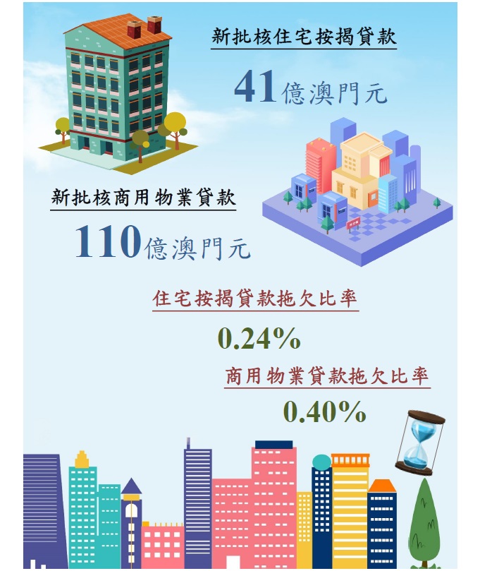 未償還商用物業貸款總額為1,631.2億澳門元,按月增加1.1%,而與一年前比較則減少8.2%;其中,居民部份佔93.4%。與一個月前比較,居民部份的未償還商用物業貸款上升1.3%,而非居民部份則下跌0.8%。