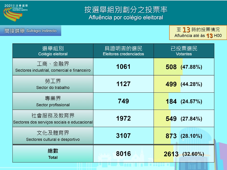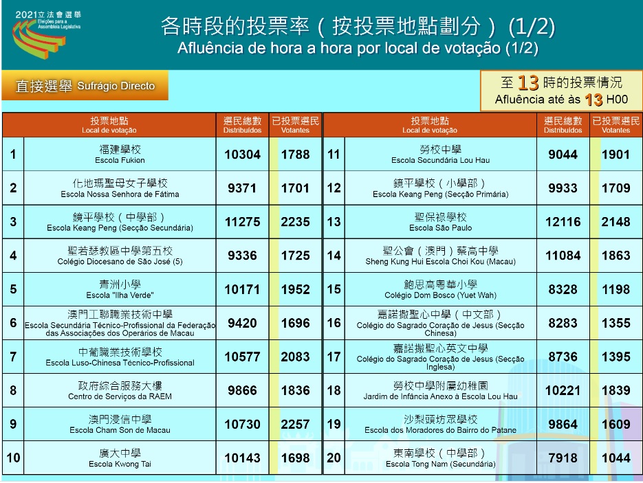 9.12立法會選舉投票已進行了4個小時,截至下午1時,直選共有56,631人投票,投票率為17.48%;間選共有2,613人投票,投票率為32.6%。