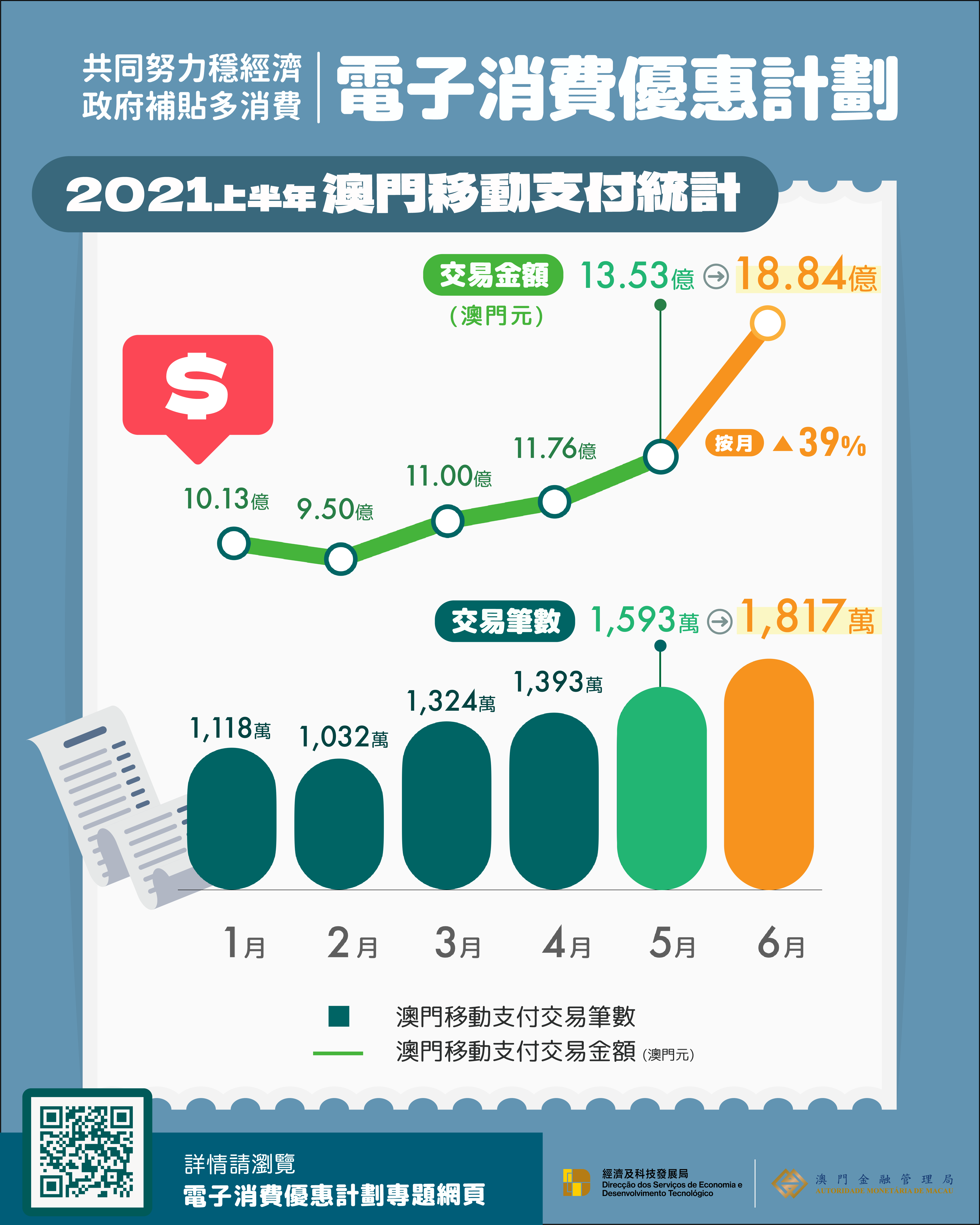“電子消費優惠計劃”自6月起推行,該月的移動支付交易數字與5月相比錄得明顯增長,交易總額按月大幅增長39%。