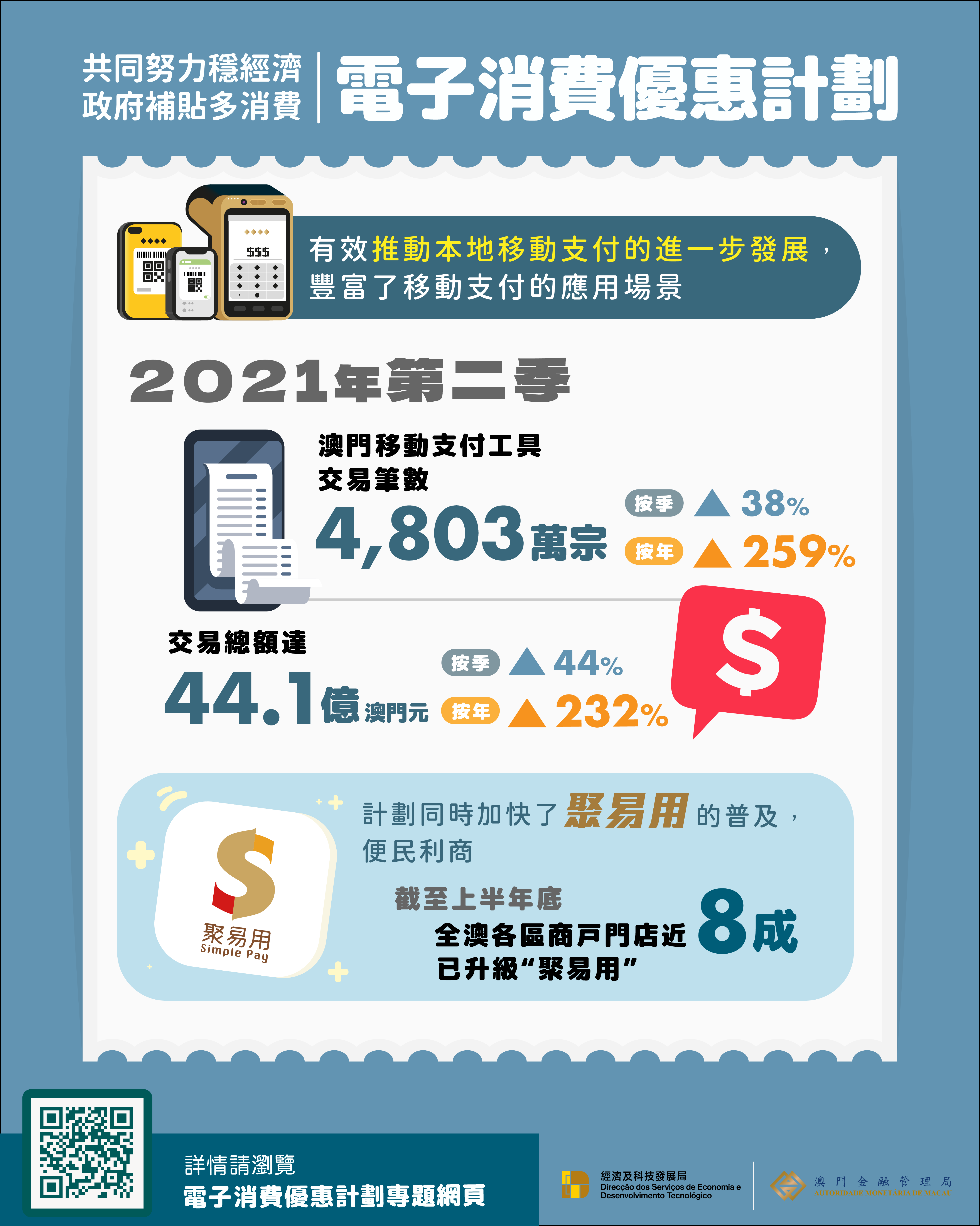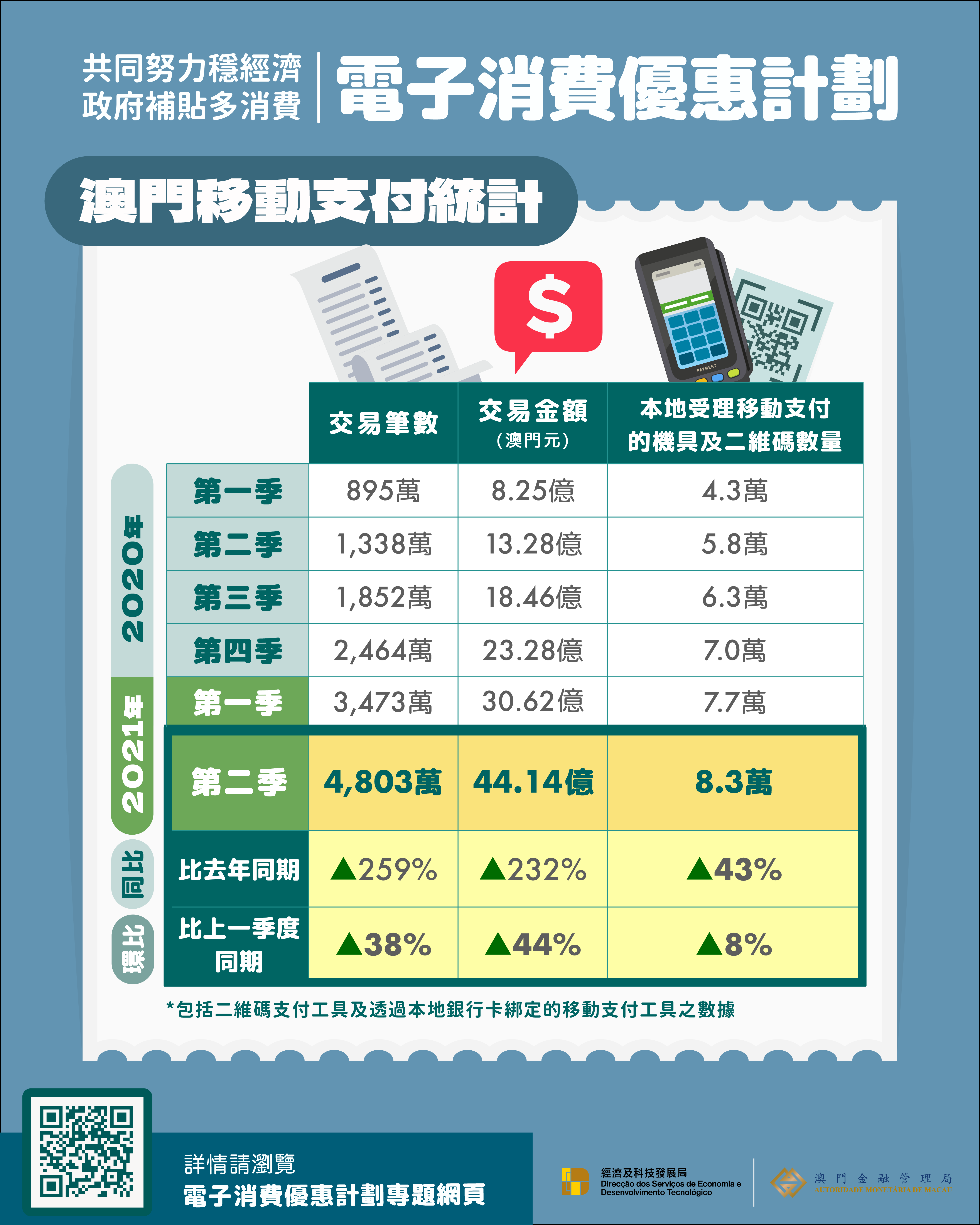 澳門移動支付工具於 2021 年第二季的交易筆數為4,803萬宗,按季上升 38%,比去年同期大幅上升259%;交易總額達 44.1 億澳門元,按季增長44%,比去年同期大幅上升232%。