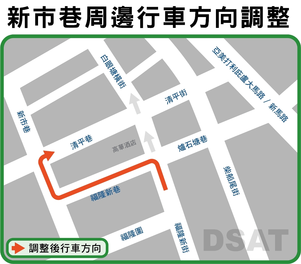 配合市政署於新市巷新建垃圾壓縮工程,新市巷周邊一帶的交通及道路設施需作出相應調整。9月21日(周二)上午10時起,福隆新街與新市巷之間的福隆新巷、福隆新巷與清平巷之間的新市巷改為反方向行車,即來自福隆新街之車輛,可選擇左轉入福隆新巷,再右轉入新市巷,經清平巷左轉入白眼塘橫街及經十月初五街離開。