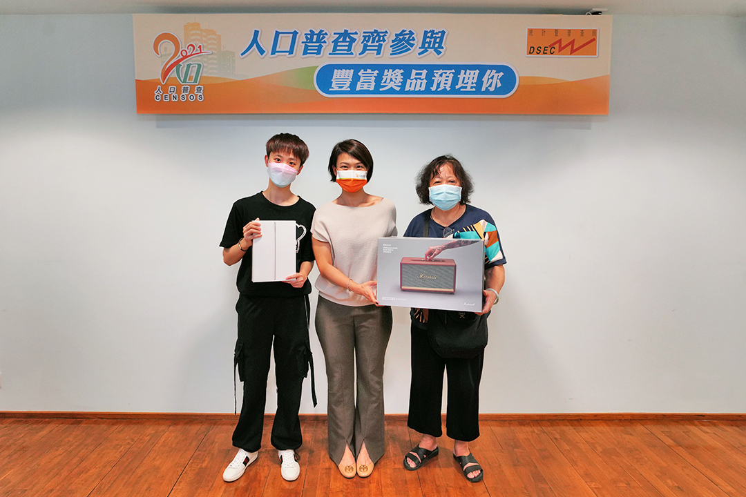 “2021人口普查齊參與”線上有獎遊戲於7月16日至8月5日期間舉行,目的是向廣大市民推廣十年一次人口普查的重要性,加深居民對人口普查的認識,藉以鼓勵居民積極配合人口普查。遊戲抽獎儀式日前在統計局及博彩監察協調局的代表監督下完成,兩份大獎包括Apple iPad 8及Marshall藍牙喇叭,另外逾2,000份獎品包括雙人電影門票、零售商戶現金券、電子支付平台充值額等,已由玩家於遊戲內自行兌換,核銷率達94.6%。