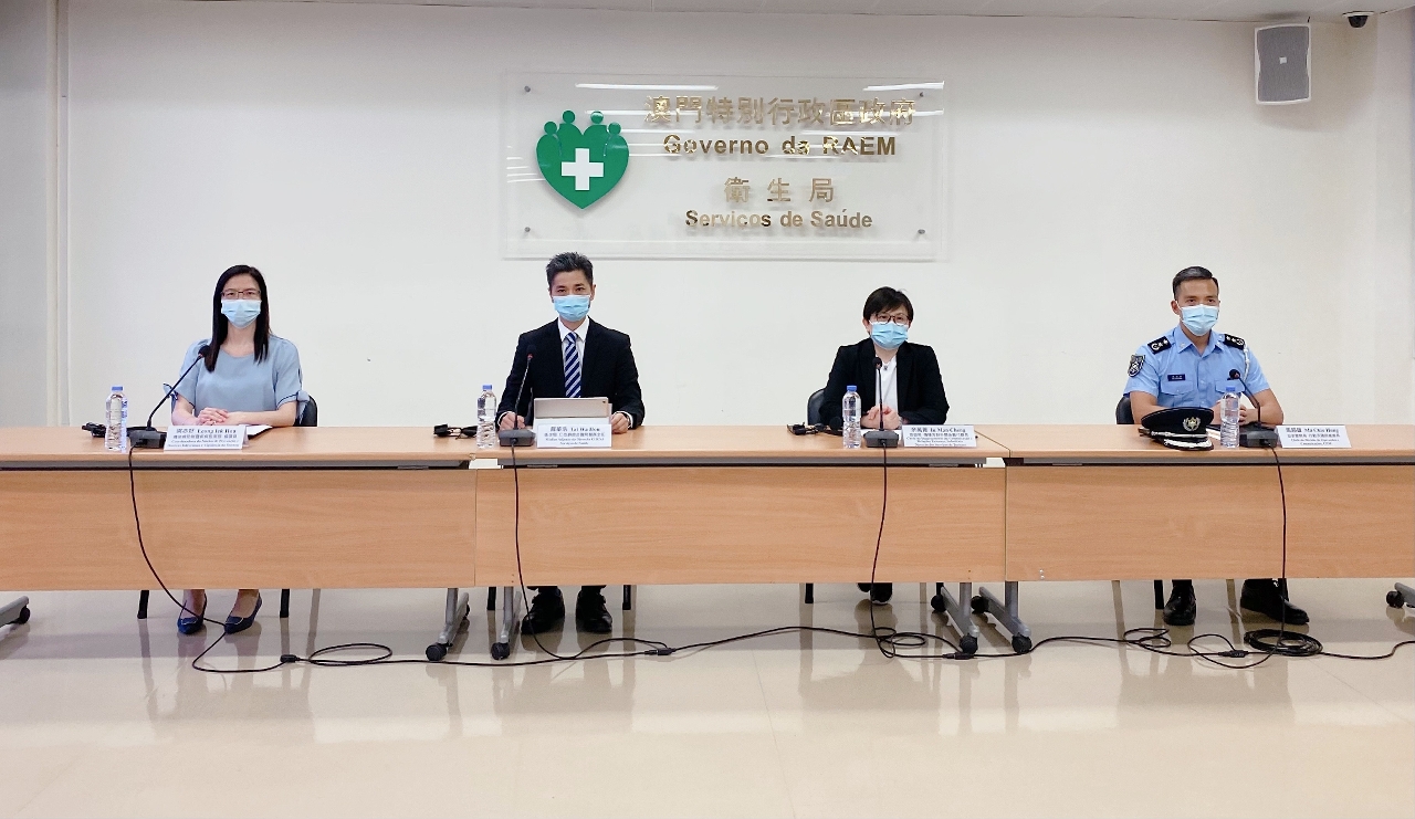 新型冠狀病毒感染應變協調中心(下稱應變協調中心)於今(23)日舉行記者會,仁伯爵綜合醫院戴華浩醫務主任、旅遊局傳播及對外關係廳余萬菁代廳長、治安警察局行動及通訊處馬超雄處長和疾病預防控制中心傳染病防制暨疾病監測部梁亦好協調員共同會見傳媒。