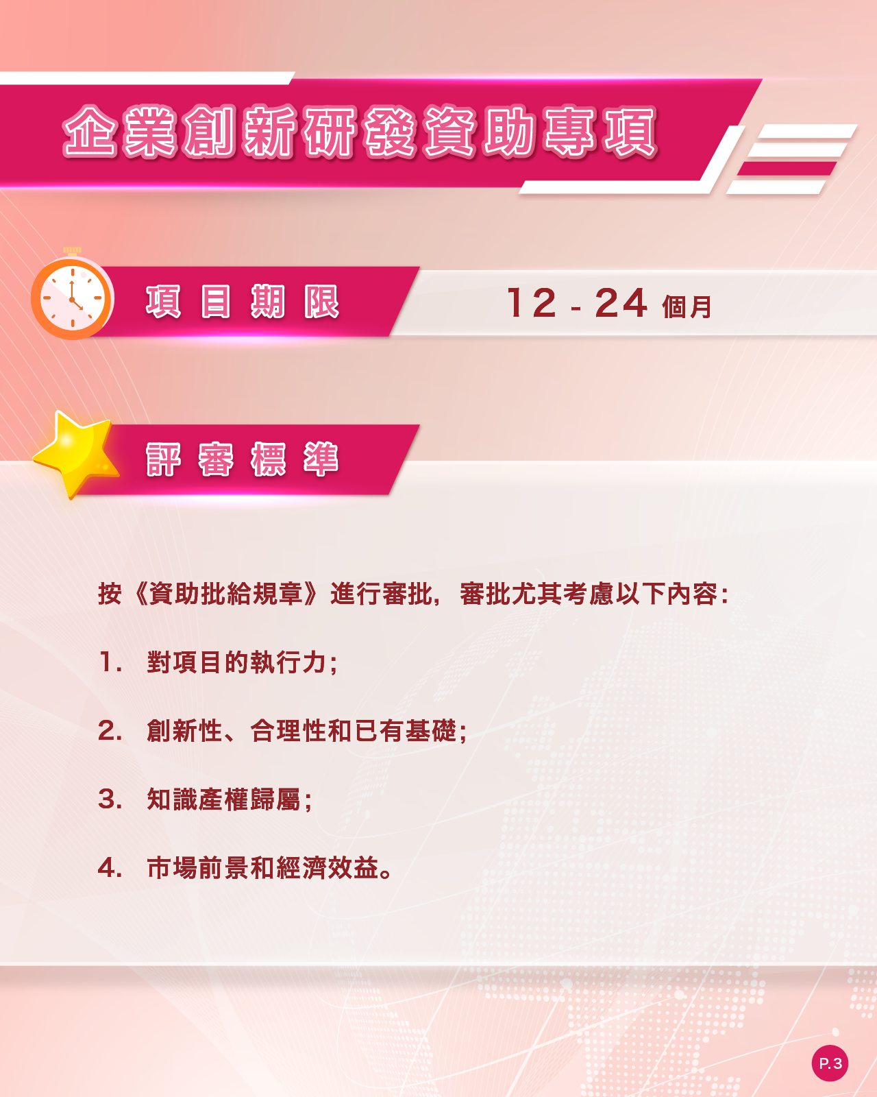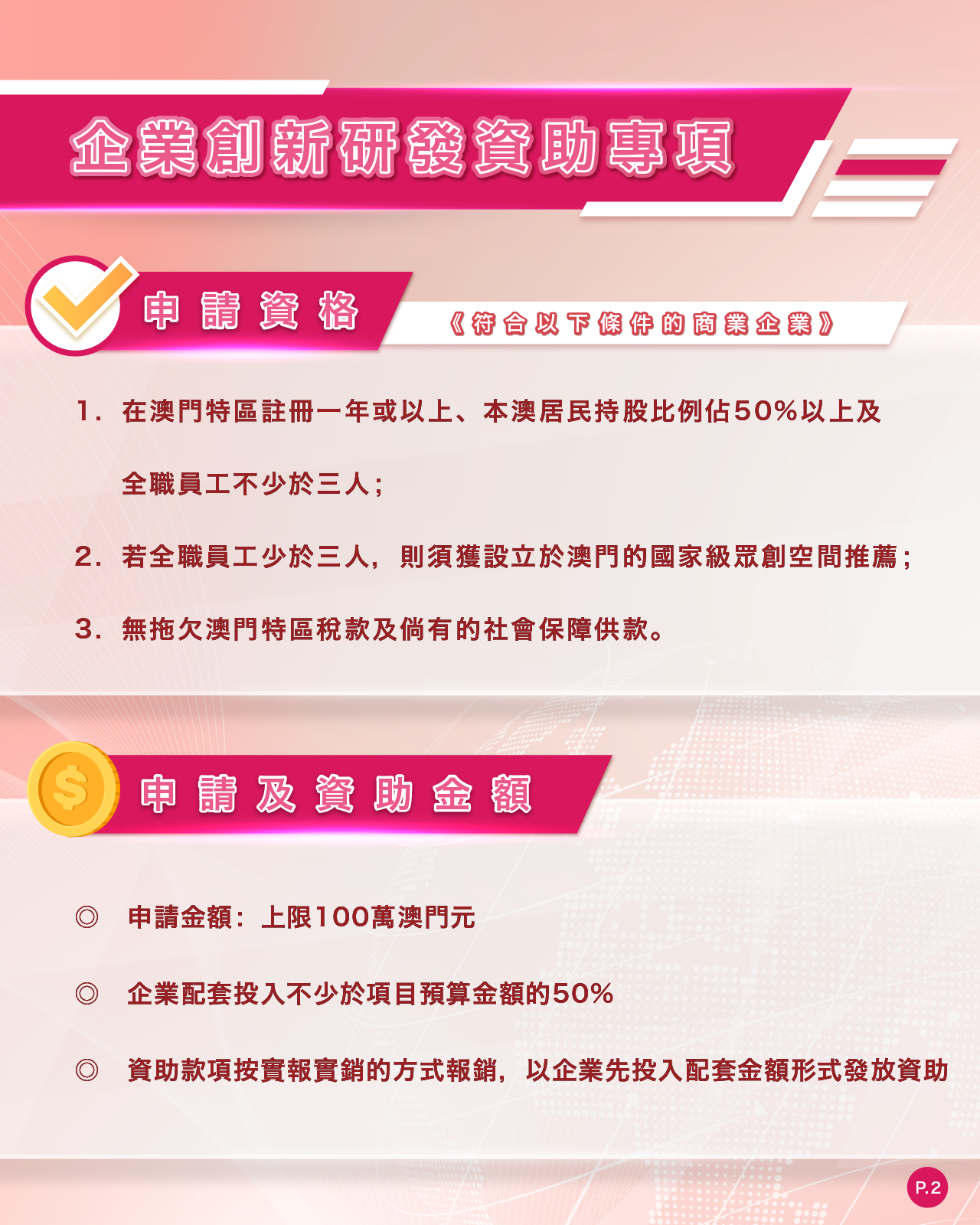 每個項目的申請金額不超過100萬澳門元,資助期限為一至兩年。面向在澳註冊一年或以上,本澳居民持股比例佔50%以上等特定條件的商業企業。 企業配套投入不少於項目預算金額的50%。