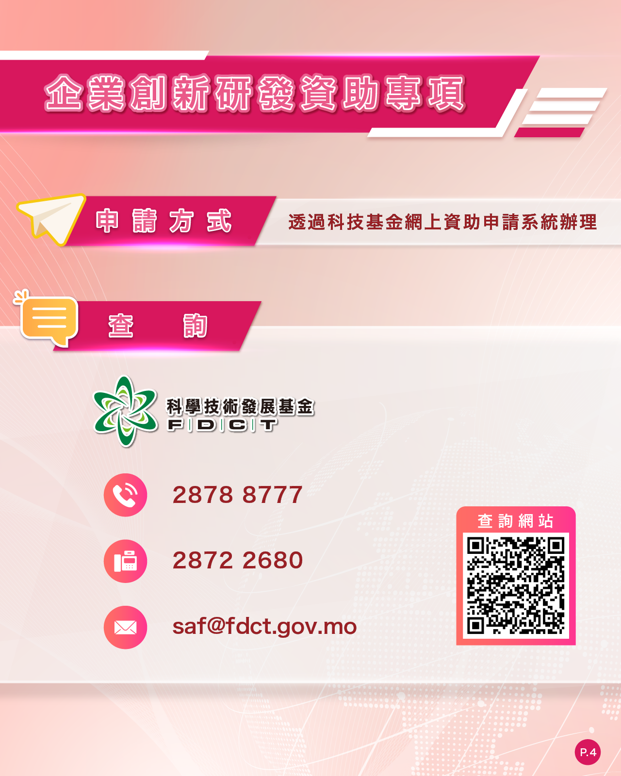 資助專項的相關內容詳情可參閱科技基金網站(http://www.fdct.gov.mo),致電28788777,或電郵saf@fdct.gov.mo查詢。