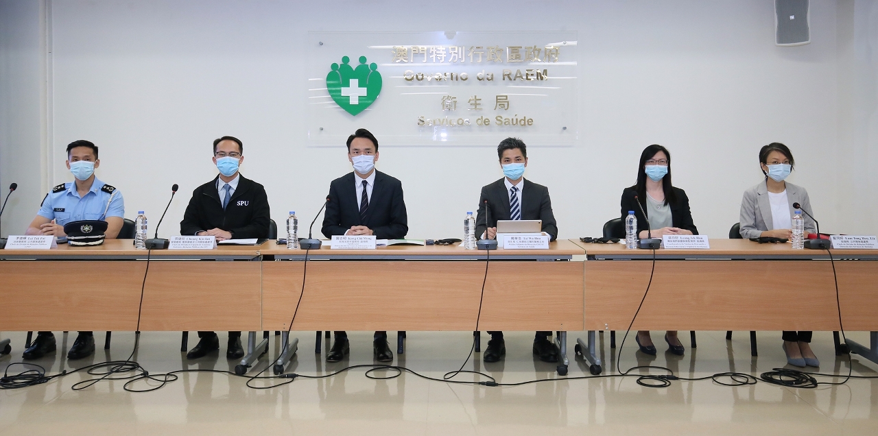 新型冠狀病毒感染應變協調中心(下稱應變協調中心)於今(30)日舉行記者會,教育及青年發展局龔志明副局長、仁伯爵綜合醫院戴華浩醫務主任、警察總局警務聯絡及公共關係處張健欣處長、旅遊局公共關係處藍同好處長、治安警察局公共關係處李德輝處長、疾病預防控制中心傳染病防制暨疾病監測部梁亦好協調員共同會見傳媒。