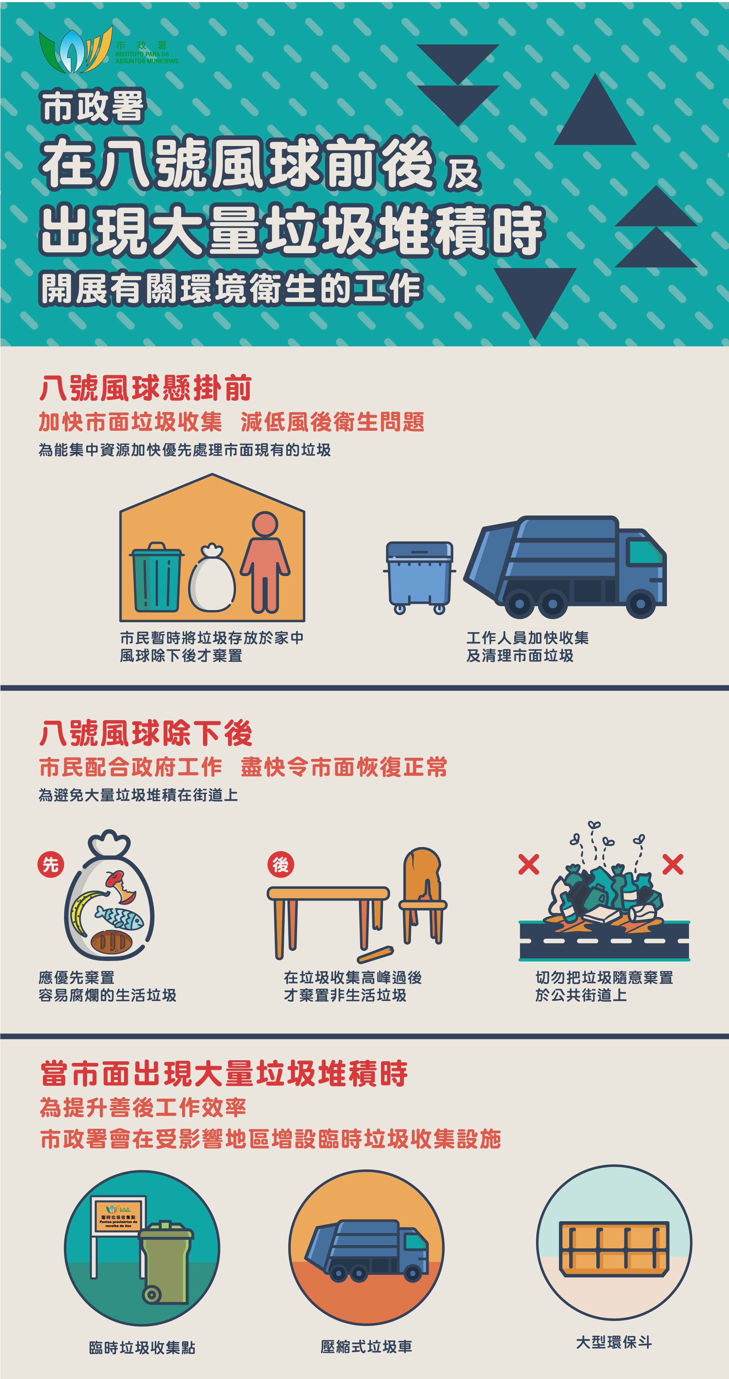 市政署呼籲居民配合,於八號風球信號發出前應將生活垃圾留置家中,於颱風過後才棄置,並待垃圾收集高峰期過後才棄置大件垃圾,以免阻礙交通,影響垃圾收集及清運工作。另一方面,市政署恆常進行廣告招牌的巡查工作,每當本澳一號風球生效時,即向各廣告招牌的持牌人發出電話短訊通知,提醒大家注意其廣告招牌的狀態,以保障公眾安全。