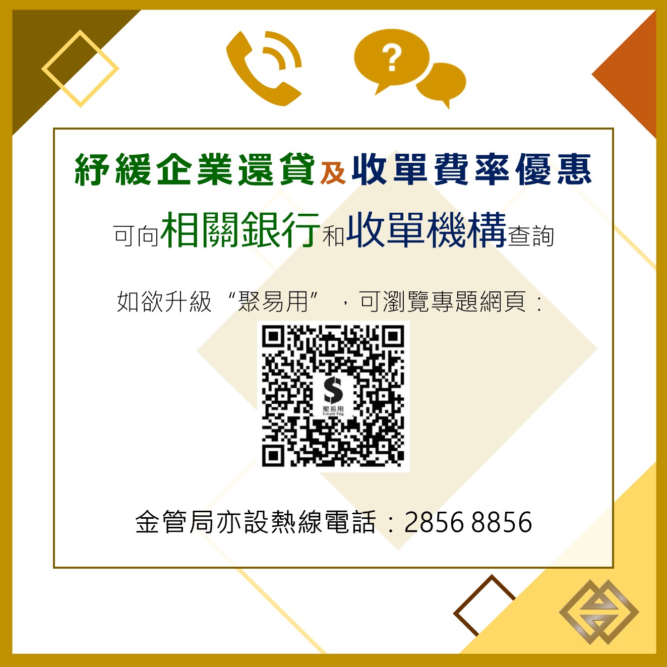 金管局感謝銀行及收單機構積極配合,與中小企及市民共渡難關。金管局亦已開通查詢熱線2856 8856,如有需要可致電查詢。
