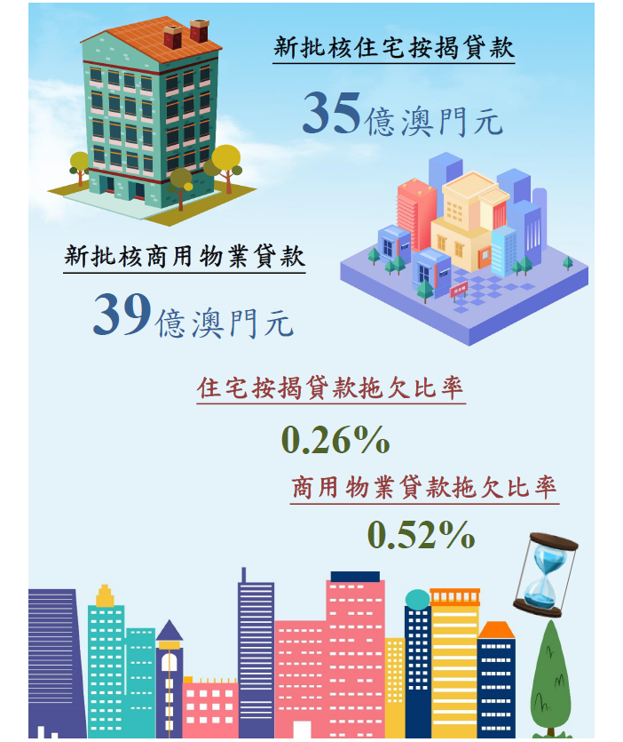 未償還商用物業貸款總額為1,636.9億澳門元,按月增加0.3%,而與一年前比較則減少8.0%;其中,居民部份佔93.5%。與一個月前比較,居民部份的未償還商用物業貸款上升0.4%,而非居民部份則下跌0.9%。