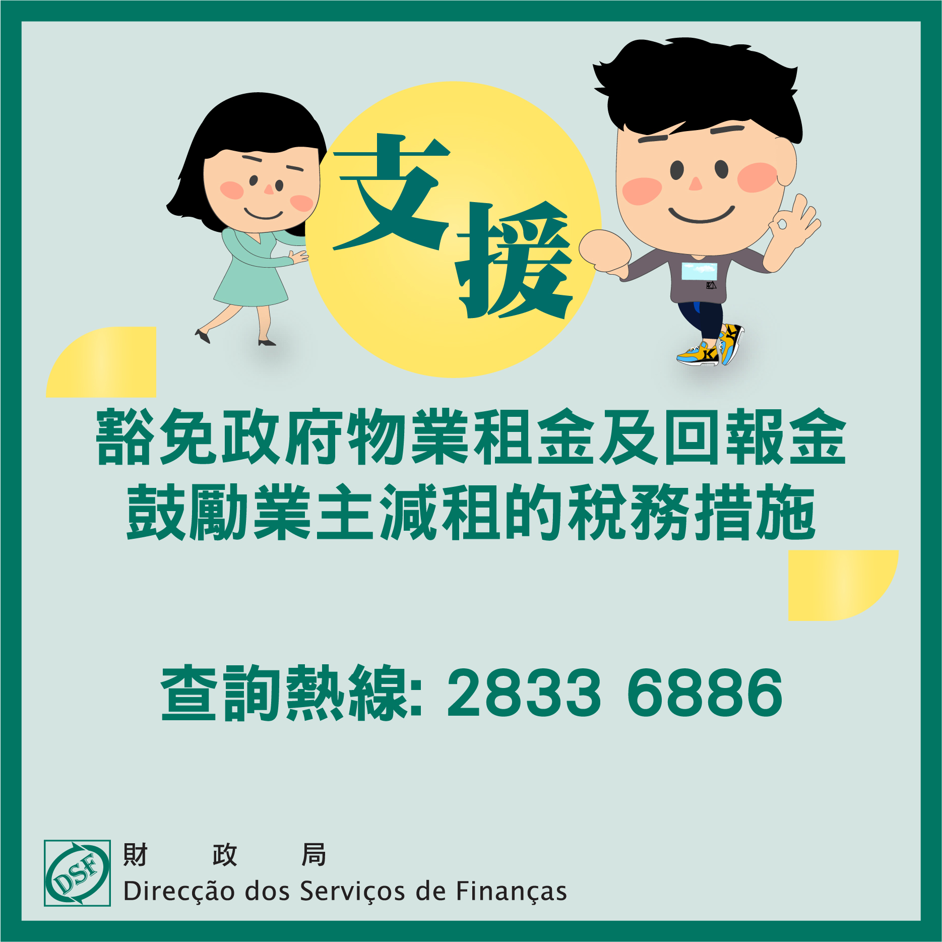 有關豁免政府物業租金及回報金、鼓勵業主減租的稅務措施,巿民倘有查詢,可致電稅務諮詢熱線:28336886。