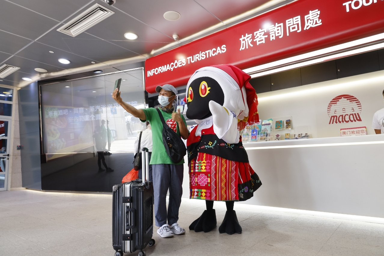 澳門旅遊吉祥物“麥麥”今(19日)現身澳門關閘歡迎抵澳旅客。旅遊局設於關閘的旅客詢問處有工作人員向旅客派發澳門旅遊小冊子,並有歡迎標語歡迎旅客。
