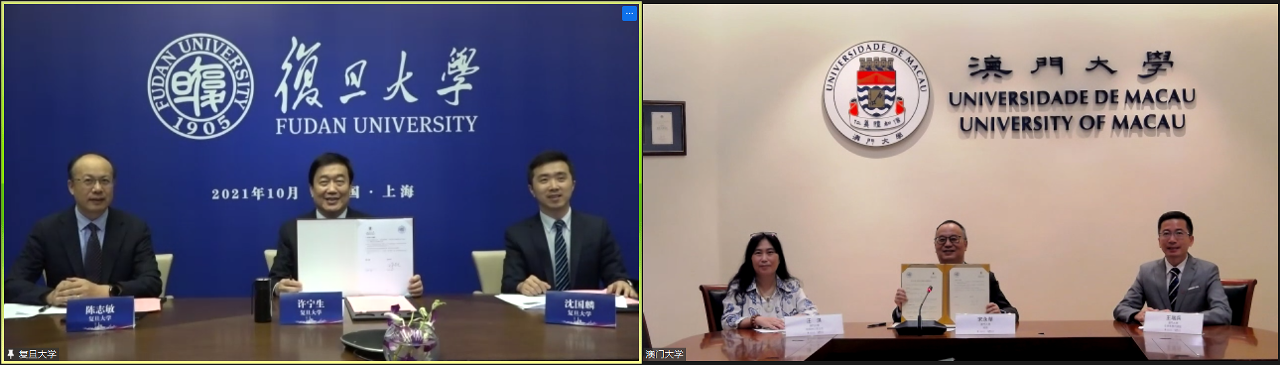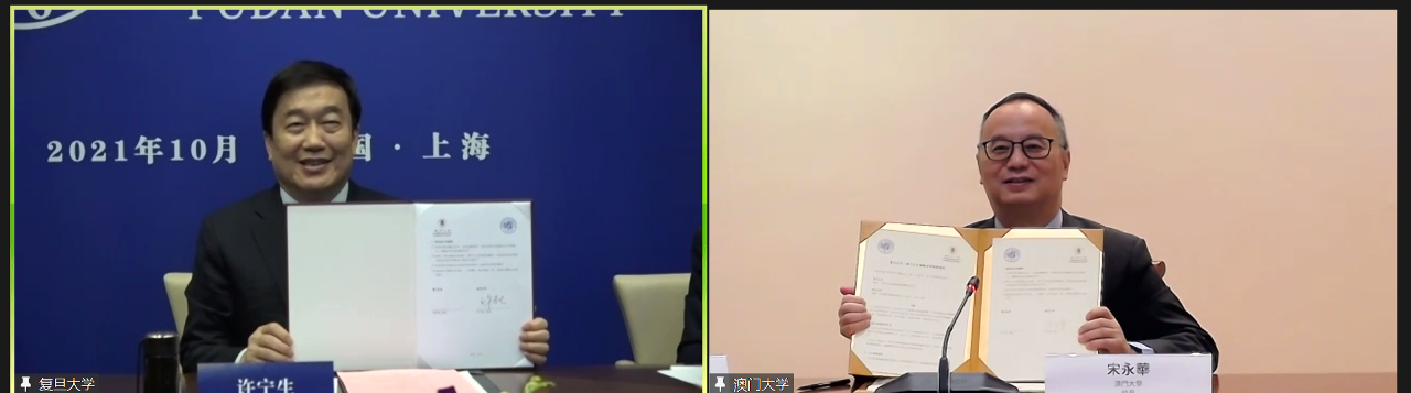 簽約儀式採線上形式進行,陪同簽約的代表還有復旦大學副校長陳志敏、港澳台事務辦公室主任沈國麟,澳門大學校長辦公室主任汪淇和全球事務代總監王瑞兵。