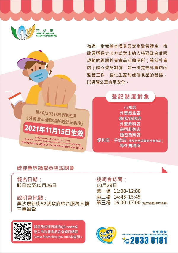 為加強食品業界對登記制度的認識,推動業界履行自身責任,市政署將於10月28日在黑沙環新街52號政府綜合服務大樓三樓禮堂舉辦三場業界說明會,第一場時間為早上11時至12時;第二場時間為下午2時45分至3時45分;第三場時間為下午4時至5時。屆時市政署食品安全廳人員將會就登記制度的設立目的、外賣場所要求、申請手續、登記識別及執法制度等作詳細解說,並即場解答疑問。說明會以粵語進行,其中第三場(下午4時至5時)設有葡語即時傳譯。食品業界可由即日起至10月26日,於辦公時間內致電8296 9963或8296 9924報名參加或查詢,或可登入食安資訊網 www.foodsafety.gov.mo 「外賣食品活動場所的登記制度」專頁內之線上報名系統進行報名,座位有限,先到先得,歡迎業界踴躍參與。