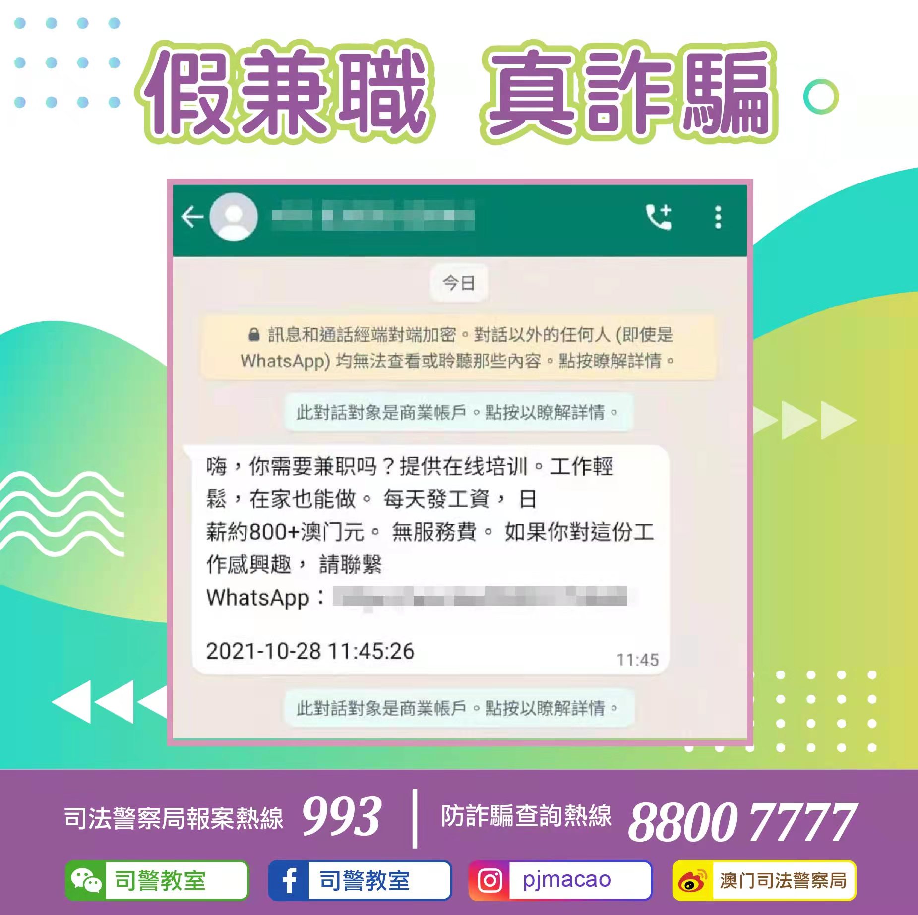 6. 懷疑遇到詐騙或其他犯罪時,應立即致電司警局防詐騙查詢熱線8800 7777或報案熱線993求助。