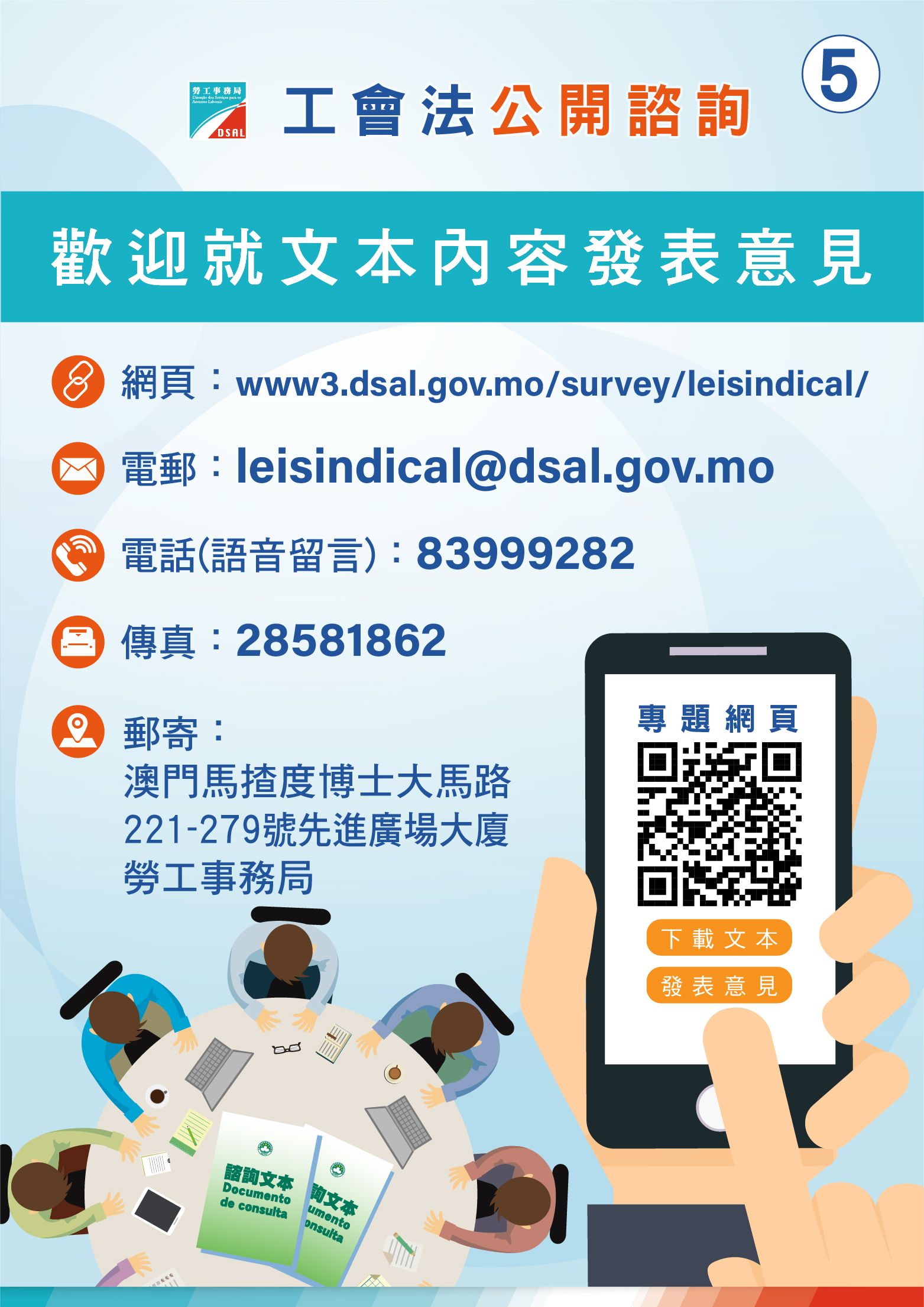 為配合新型冠狀病毒的防疫工作,每場公眾諮詢會的入場人數將會設有限制,有意出席諮詢會的公眾需透過勞工事務局的專題網頁(www3.dsal.gov.mo/survey/leisindical/)進行網上登記。