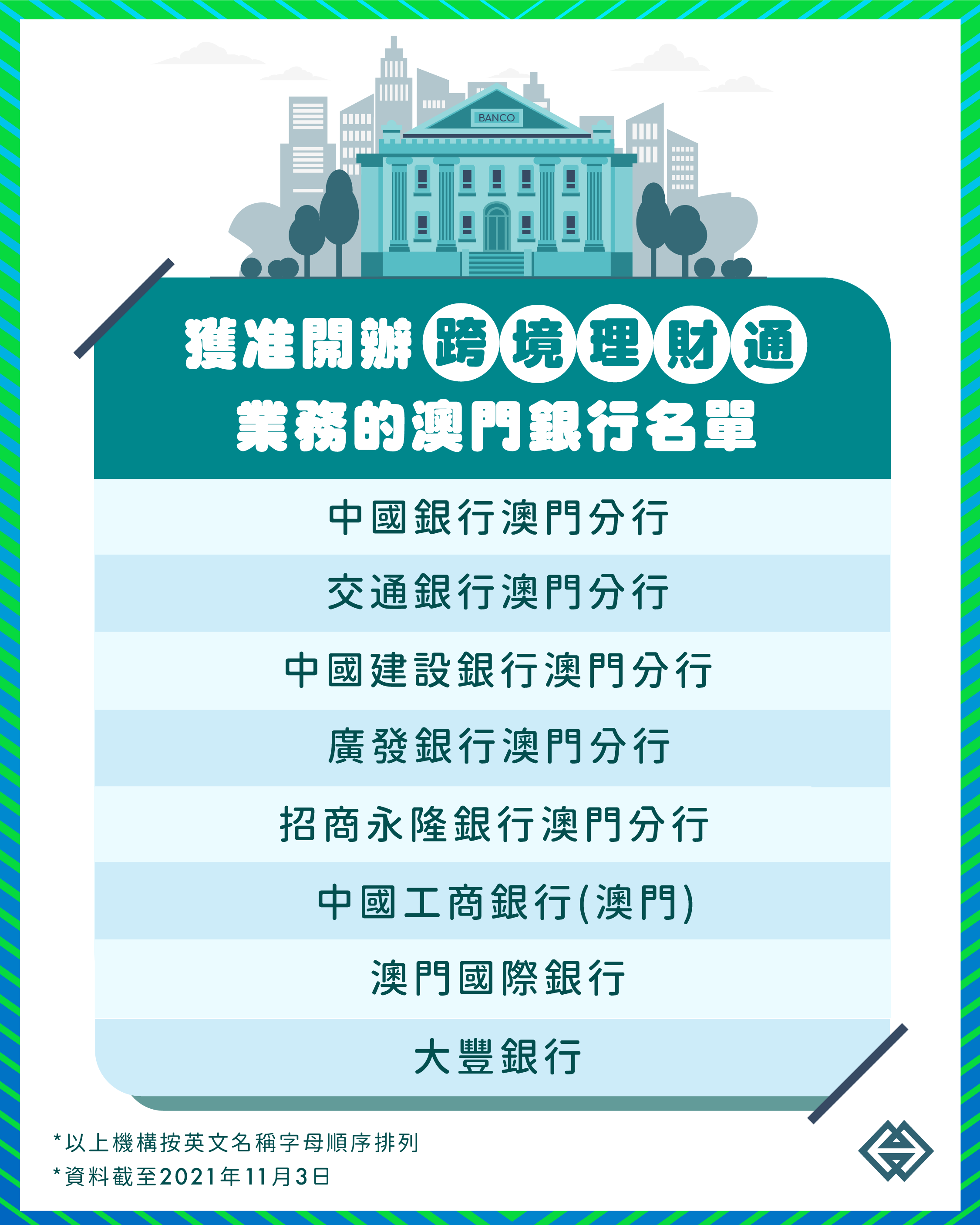 現參與“理財通”業務的澳門銀行共8家,包括中國銀行股份有限公司澳門分行、交通銀行股份有限公司澳門分行、中國建設銀行股份有限公司澳門分行、廣發銀行股份有限公司澳門分行、招商永隆銀行有限公司澳門分行、中國工商銀行(澳門)股份有限公司、澳門國際銀行股份有限公司,以及剛獲批開辦業務的大豐銀行股份有限公司。相關銀行及其對應的內地合作銀行清單,已上載到金管局的“跨境理財通”專頁。